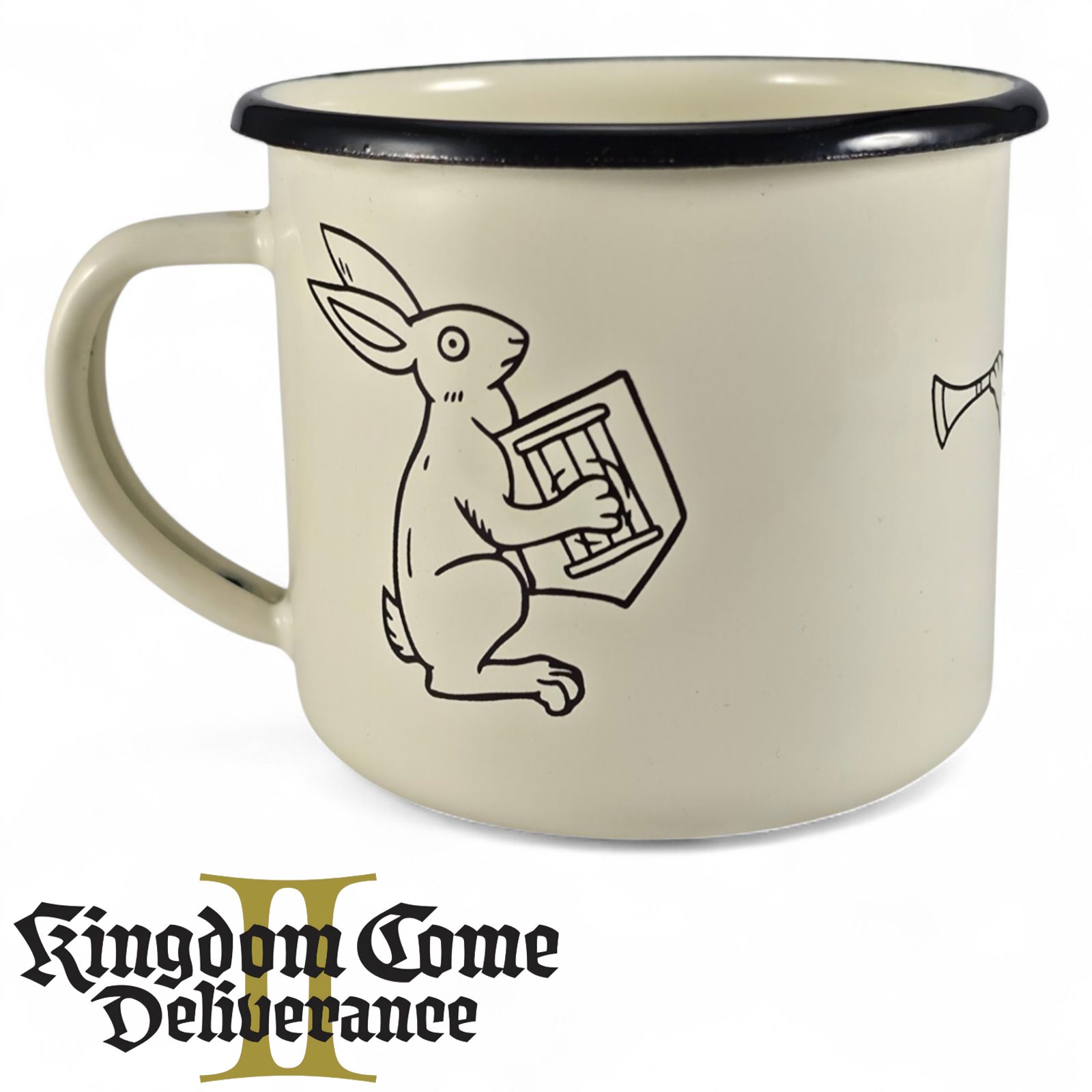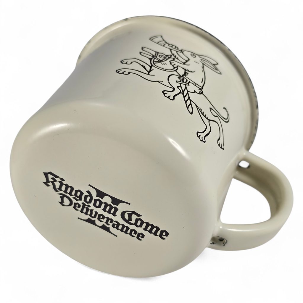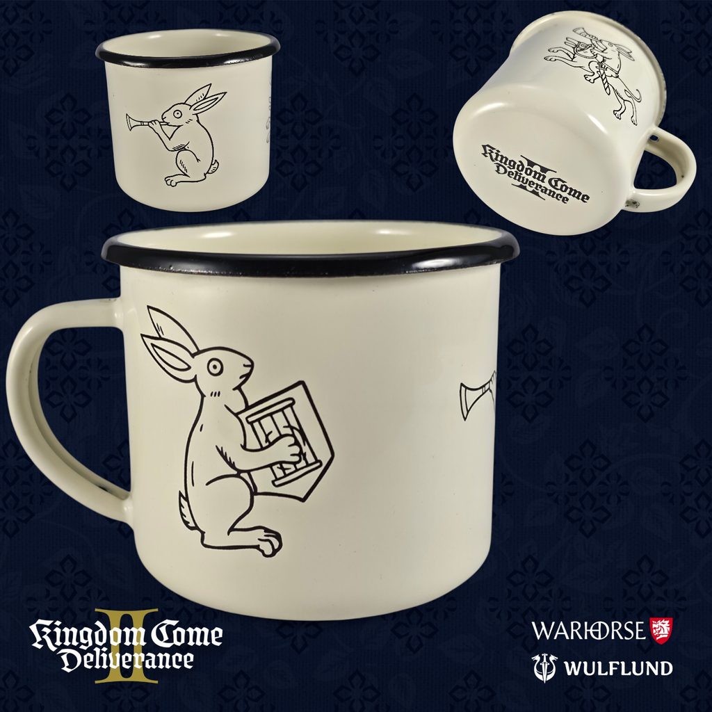 Smaltovaný hrnek v oficiální licenci Kingdom Come: Deliverance II. Tři veselí zajíci Ti budou dělat společnost při ranní kávě, čaji i při večerním odpočinku.