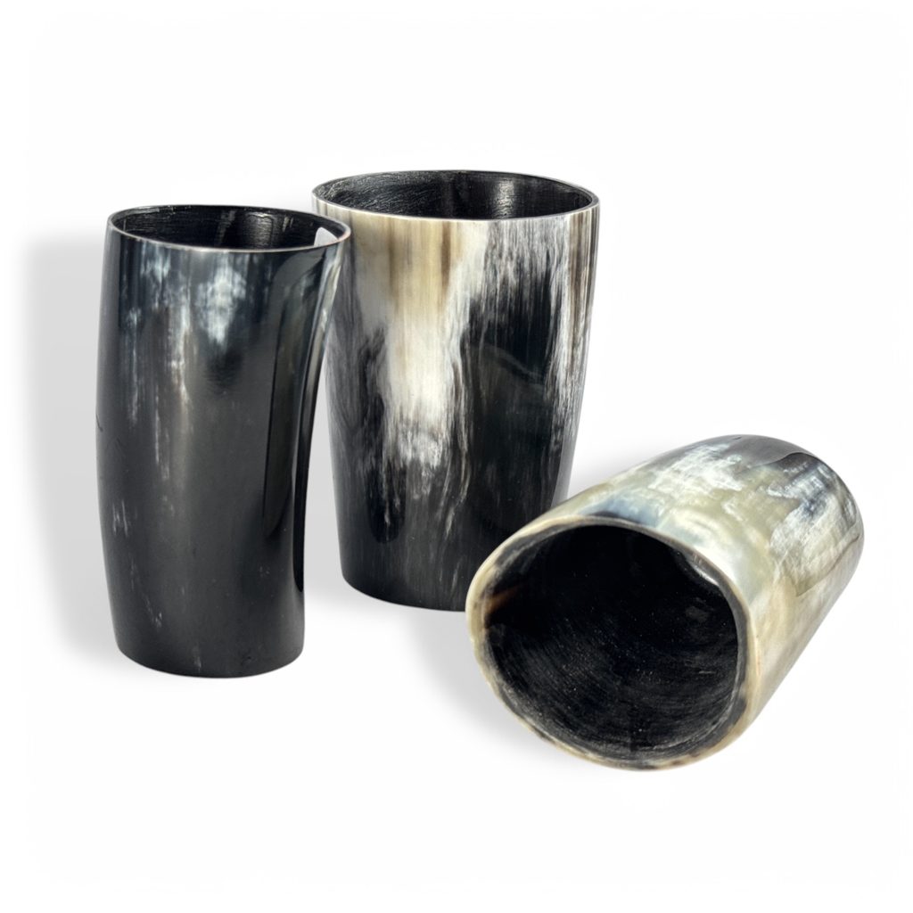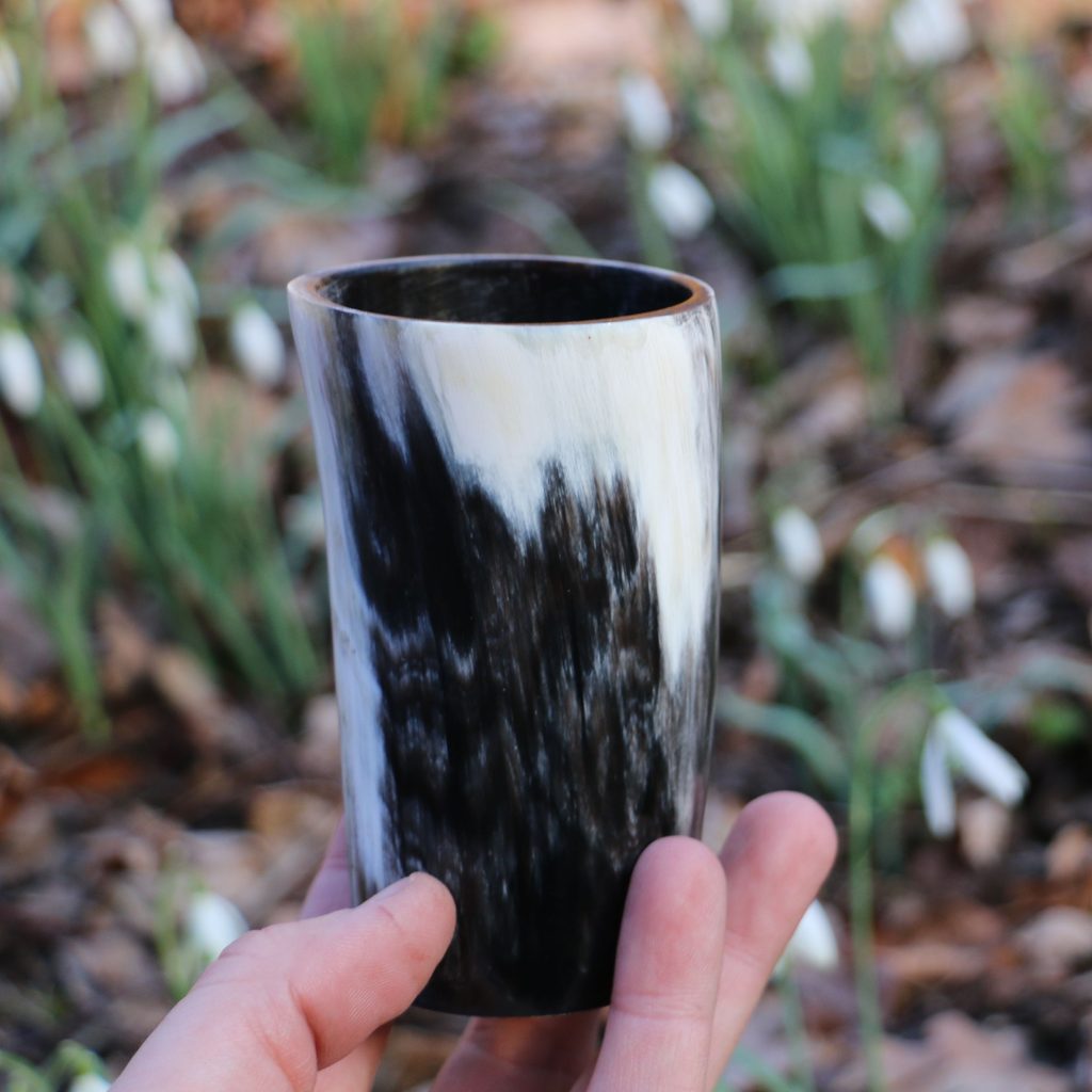 Pohár z kravského rohu o objemu 0.2 litru. Rohovina je ošetřena zevnitř potravinářským lakem. Vyrobeno v EU.