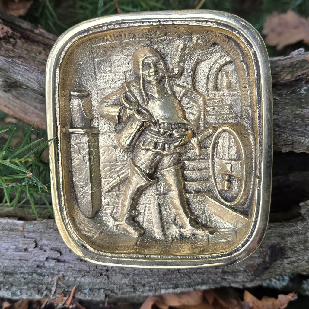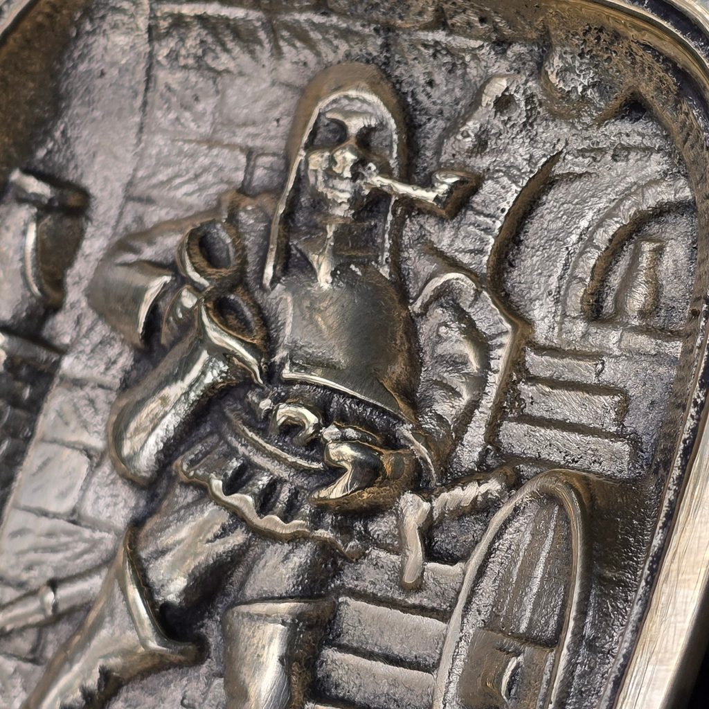 Mosazný popelník s reliéfním vyobrazením mušketýra.
