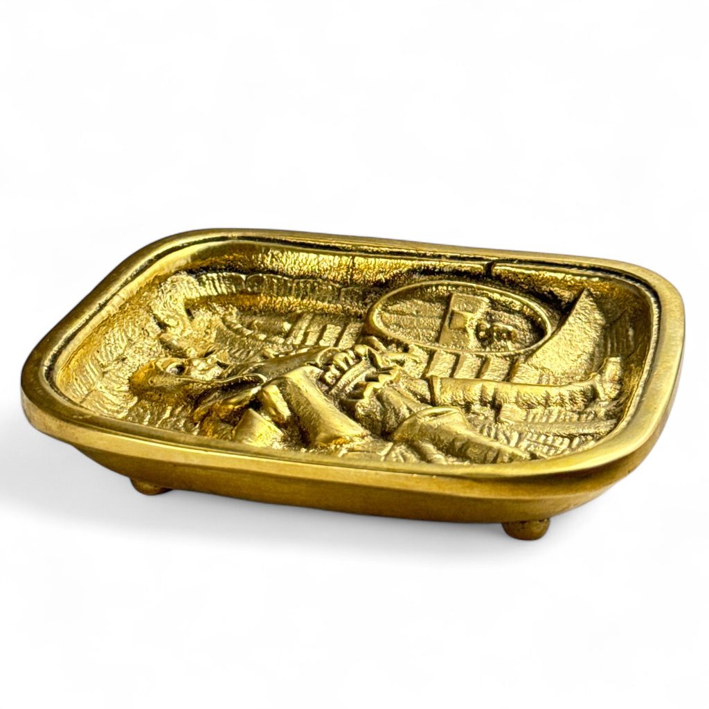 Použití: popelník – mosazné provedení zajišťuje odolnost vůči teplu i kouři, často se jednalo o sběratelský nebo suvenýrový předmět.