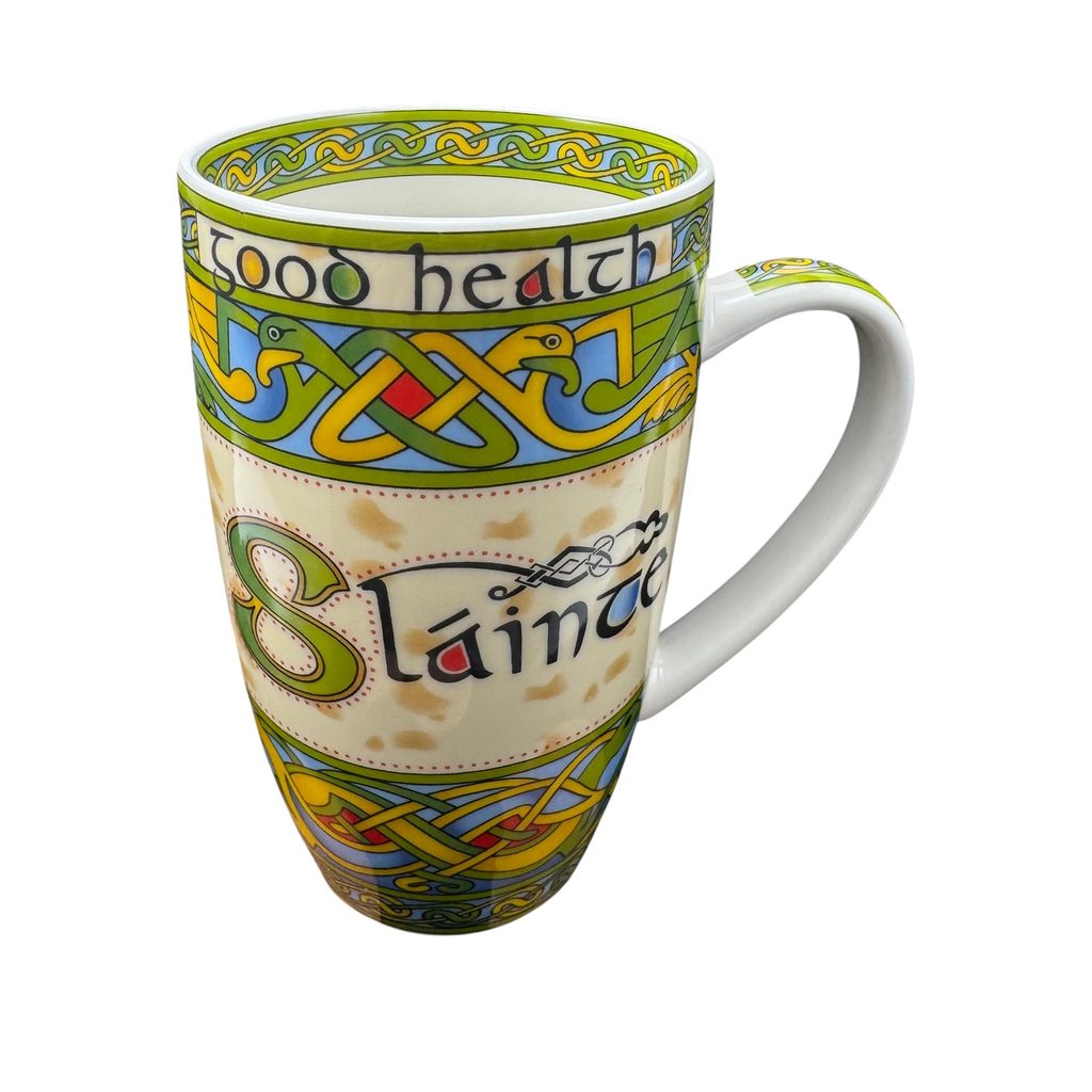 Tento hrnek z kostního porcelánu s vyobrazením irského přípitku „na zdraví“ je navržen ve stylu starověkých keltských rukopisů z 9. století, které mniši malovali na pergamen nebo telecí kůži.