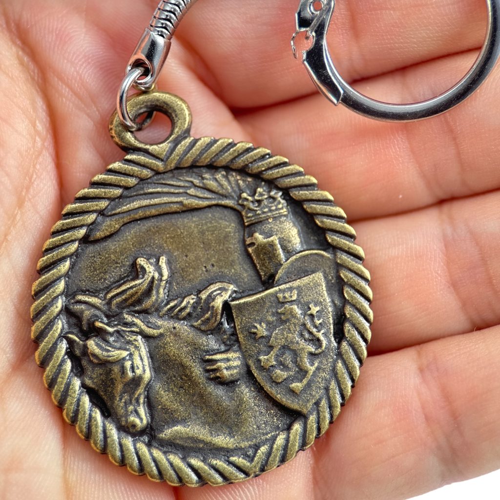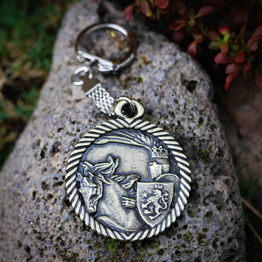 Král železný a zlatý - Přemysl Otakar II. - klíčenka. Turnajová přilba s klenotem ze supích per. Podoba šperku je převzata z Gelnhausenova kodexu.
