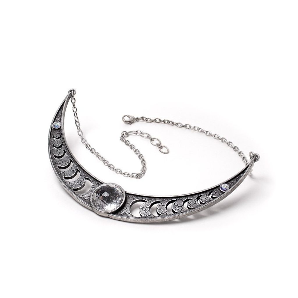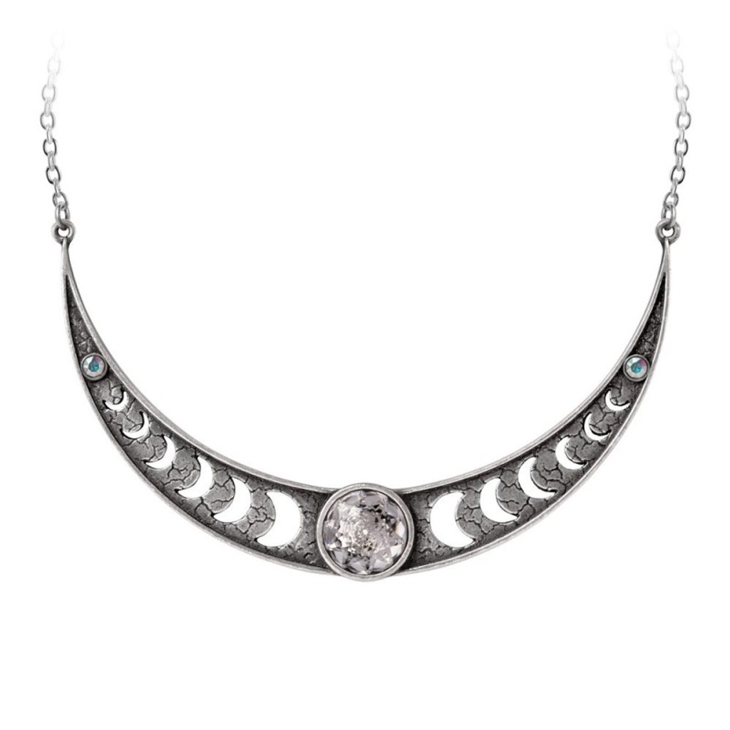 Výrazný náhrdelník ve tvaru srpku měsíce, zdobený motivem měsíčních fází a osázený mystickými krystaly rakouského brusu!
