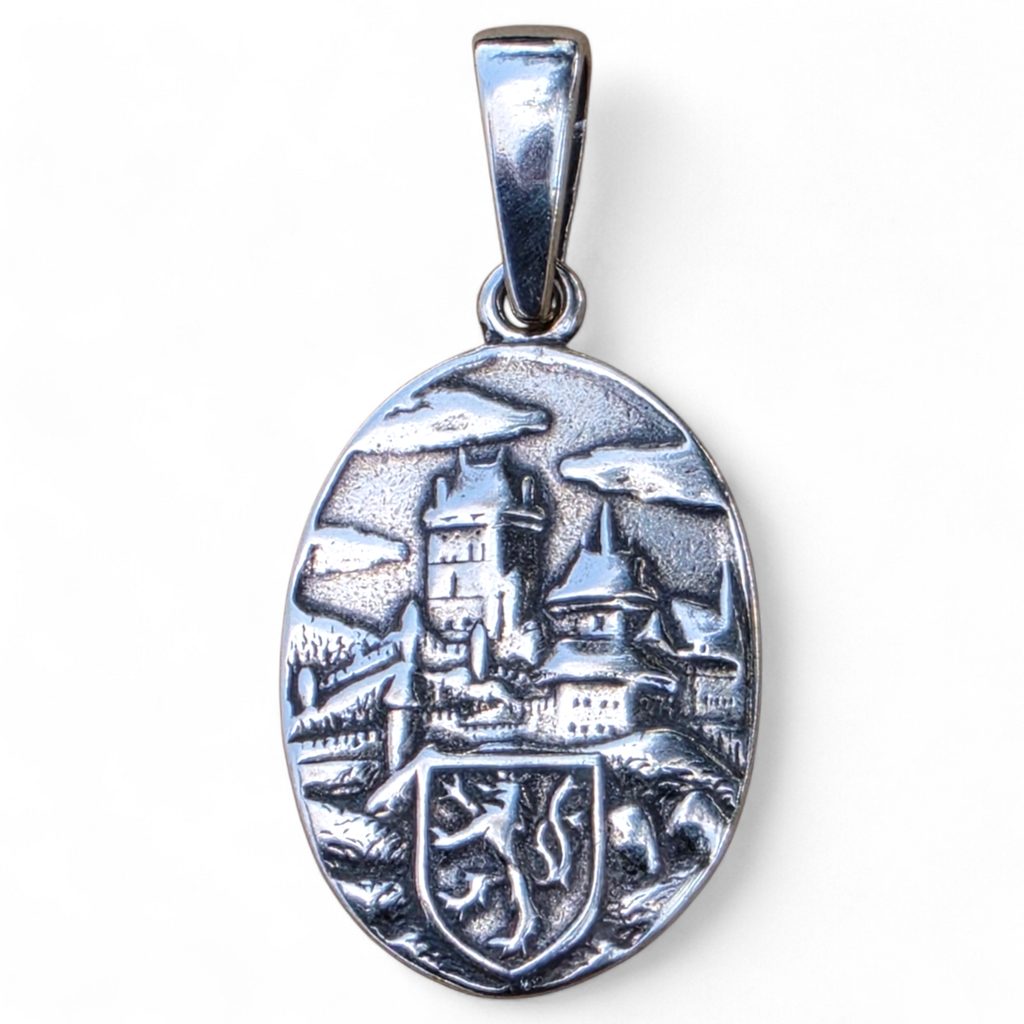 Hrad Karlštejn jako jemný přívěsek ze stříbra 925/1000. Vzor pochází z mnoho let staré raznice, kterou vlastní rodina místního rodáka.