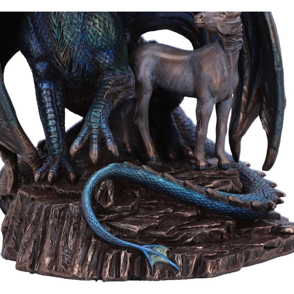 Figurka je zpracovaná s důrazem na detaily, šupiny draka, křídla i povrch podstavce působí realisticky a plasticky. Povrchová úprava bronzem dodává celku hloubku a decentní kontrast barev.
