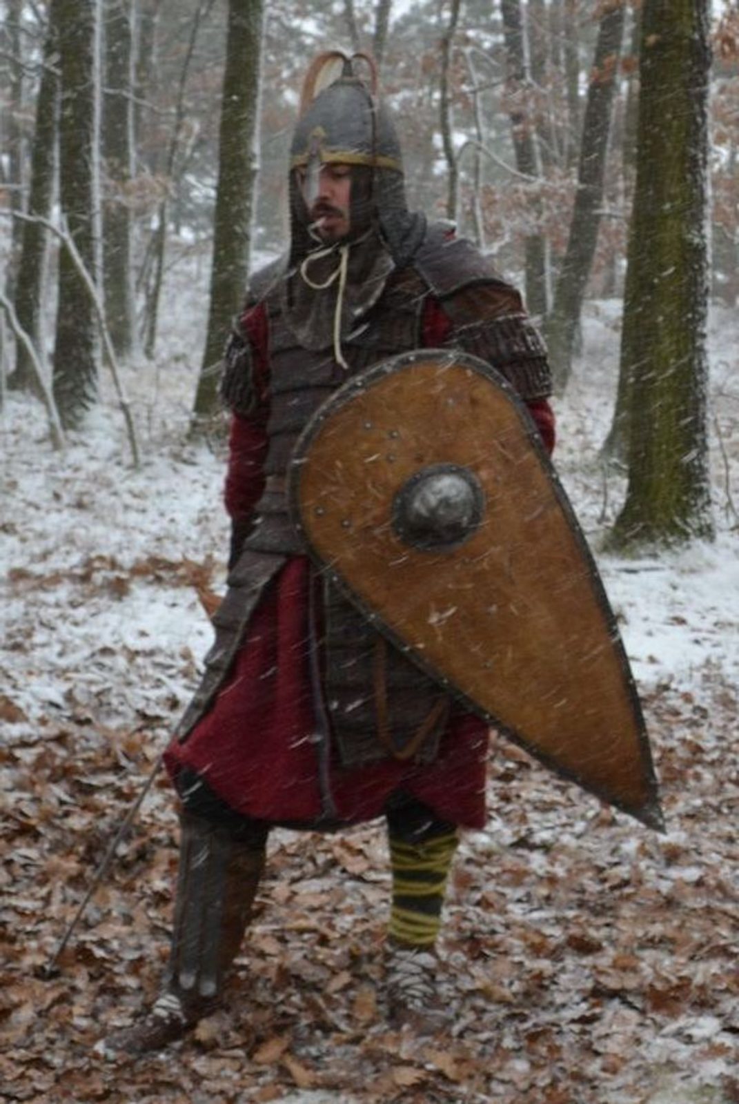 Kostým Varjaga - východního Vikinga. Součástí kostýmu jsou: boty, ovinky, kalhoty, kaftan (kabátec), lamelová zbroj, meč s pochvou, mandlový štít a přilba s vycpávkou (dle nálezu z lokality Gnezdovo).
