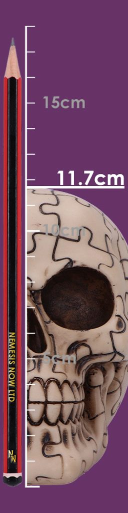 Dekorace z řady Puzzled zobrazují lebky pokryté reliéfem připomínajícím dílky skládačky. Na první pohled působí, jako by byly sestavené z desítek propojených částí. Jemné linie a kontrastní stínování zvýrazňují tvar i texturu, takže lebka získává zajímavý plastický vzhled.