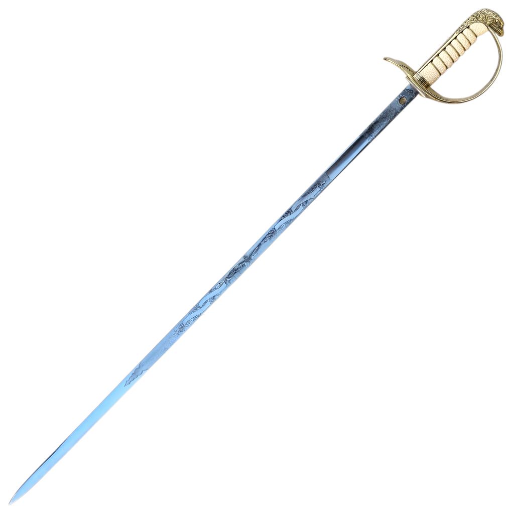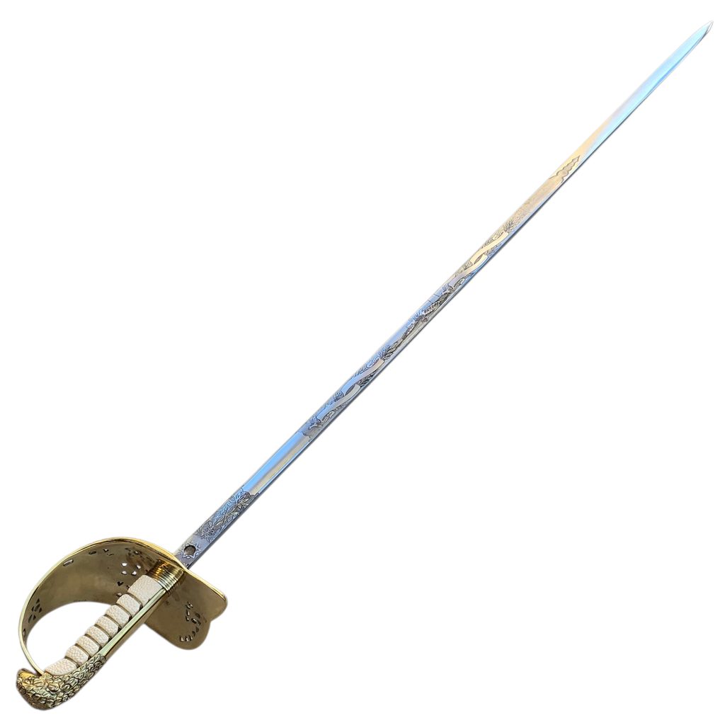 Čepel meče je vyrobena z vysokouhlíkové oceli EN9, která zajišťuje pevnost a odolnost. Je bohatě zdobena a doplněna o detailně zobrazený královský erb Spojeného království (Royal Coat of Arms of the United Kingdom). Povrch čepele je hladký, s jemně matným leskem.
