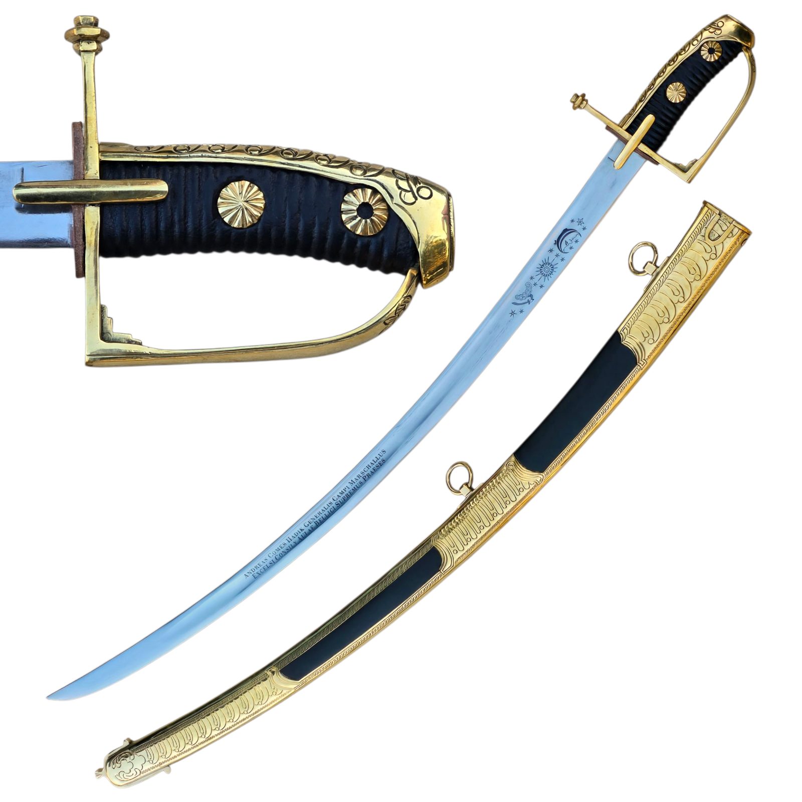 Tato rakousko-uherská husarská důstojnická šavle má zahnutou čepel z uhlíkové oceli 1065 AISI, na níž je na jedné straně reliéf s astronomickým motivem, a na druhé straně latinský nápis: