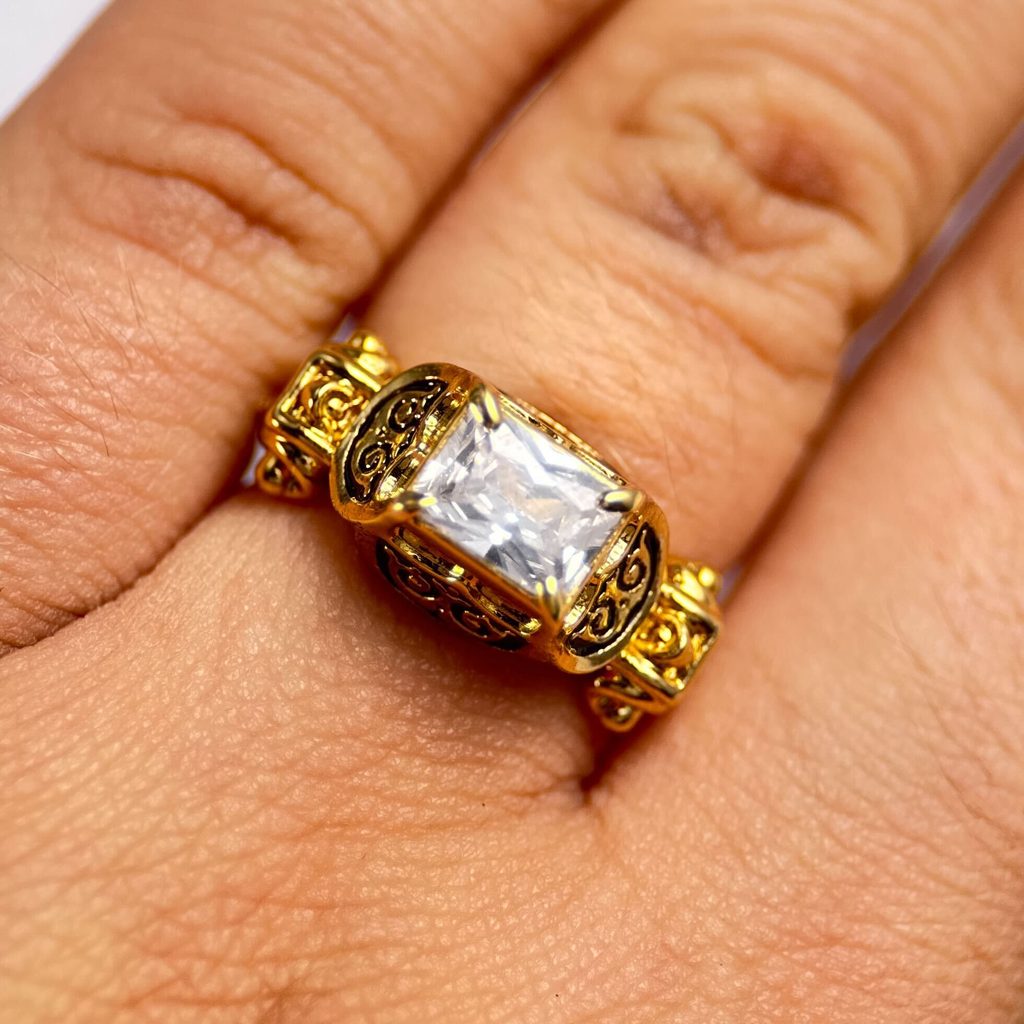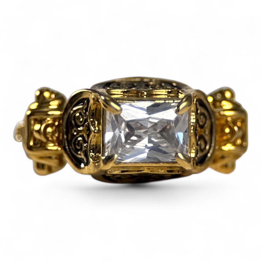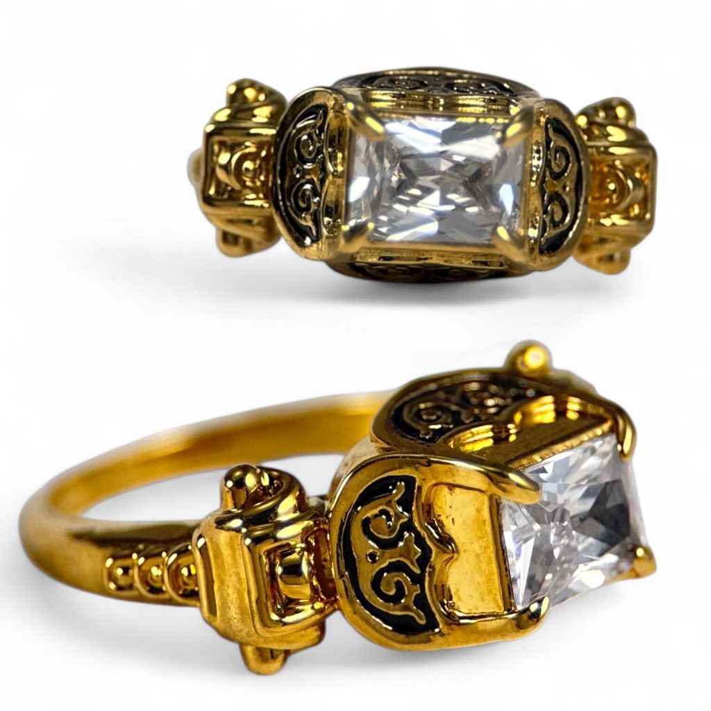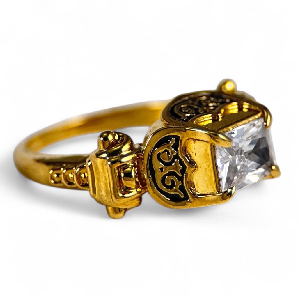 Tento tvar prstenu byl velmi oblíbený v 16. století v západní Evropě. Prsten je odléván z mosazi s povrchovým pozlacením, zdobený studeným smaltem a zirkonem.