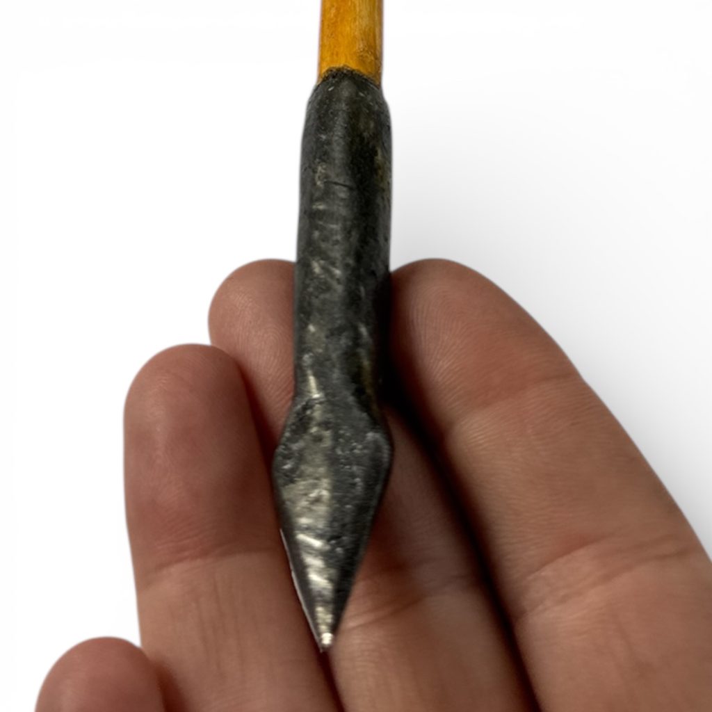 Dřevěná tyč je dlouhá přibližně 75 cm, případně delší podle dohody. Letky z husích per jsou pevné a dobře drží let. Hrot je terčový, takže je vhodný na běžné terče i cvičné použití.