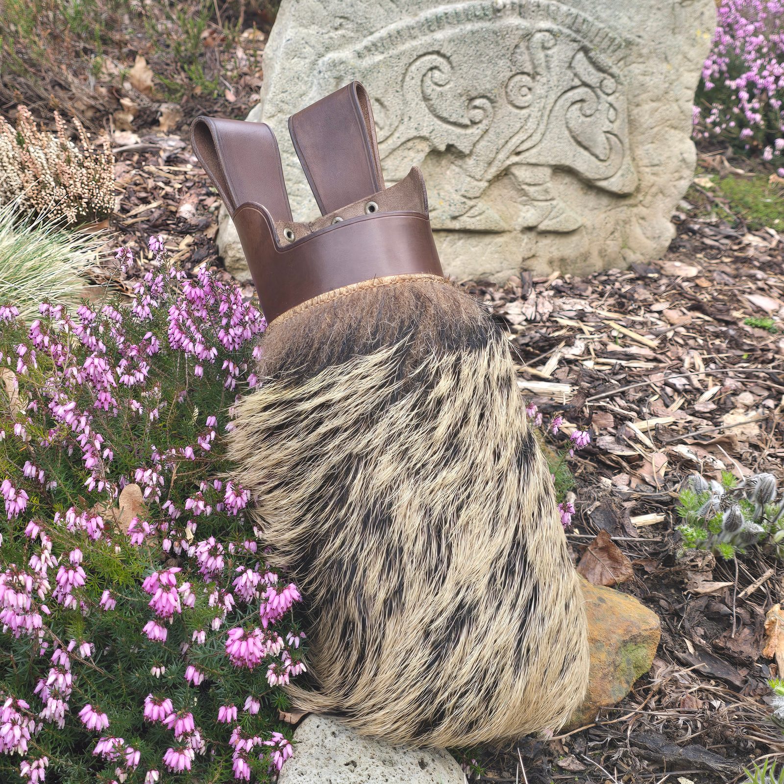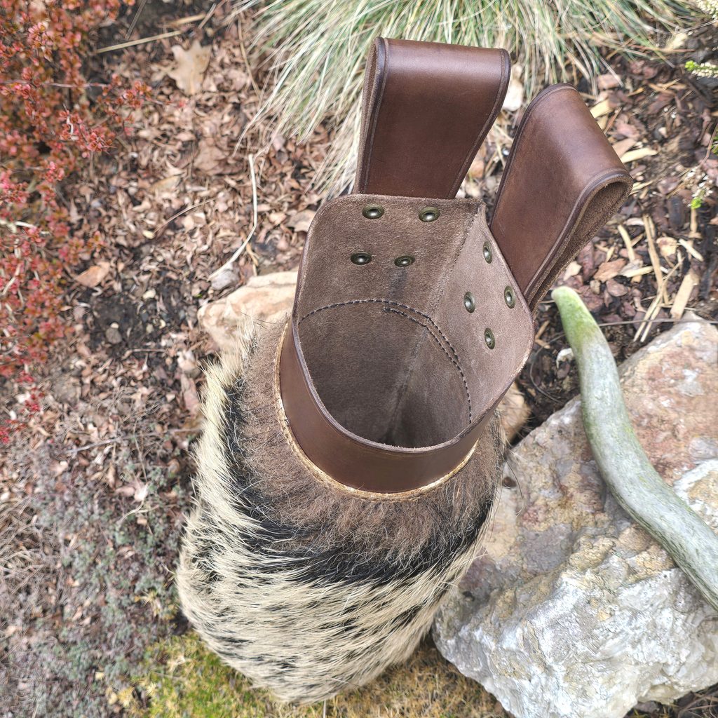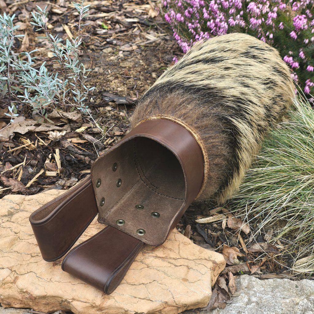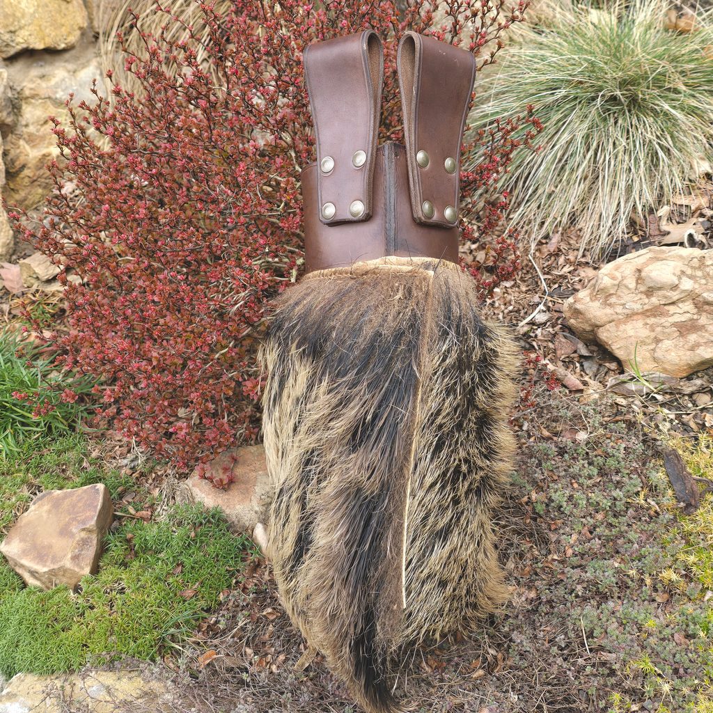 Toulec na šipky je vyroben z horního nástavce a dolní části se srstí. Nástavec toulce je vyroben z hovězinové hlazenice o síle 2,5-3 mm. Na nástavec je našita ozdoba - lilie. Dolní část toulce je vyrobena z kančí srti. Výška toulce: je 28 cm.