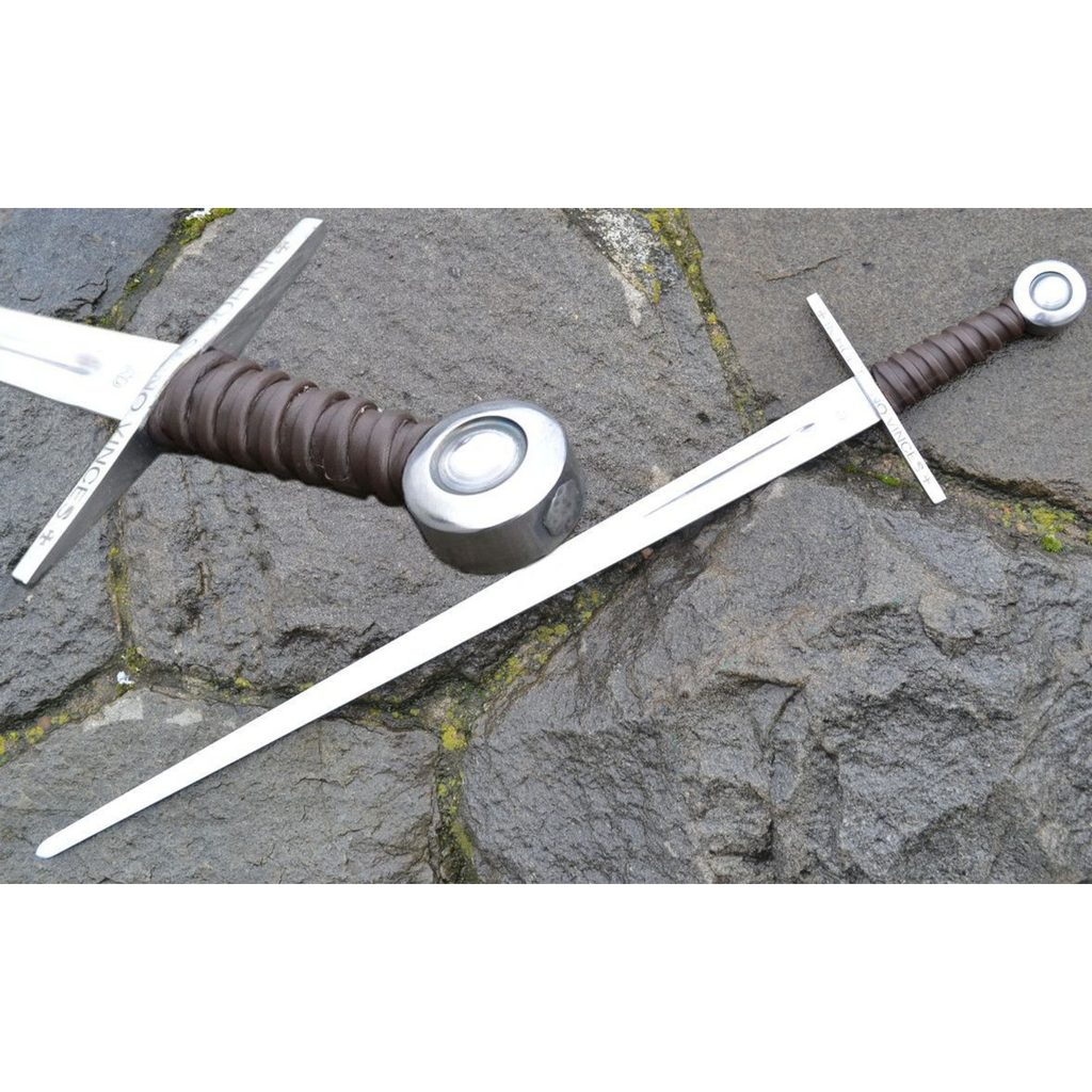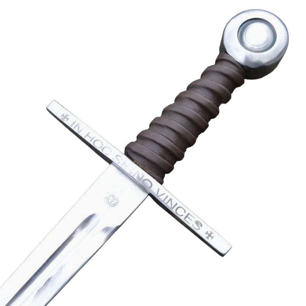 JEDNORUČNÍ MEČ s leptaným nápisem "In Hoc Signo Vinces", "v tomto znamení zvítězíš". Meč je samozřejmě určen pro historický šerm, 2 roky záruka a možný i pozáruční servis. Záštita zavařená mosazí, aby se samovolně neuvolňovala. Kvalitní kožená omotávka.