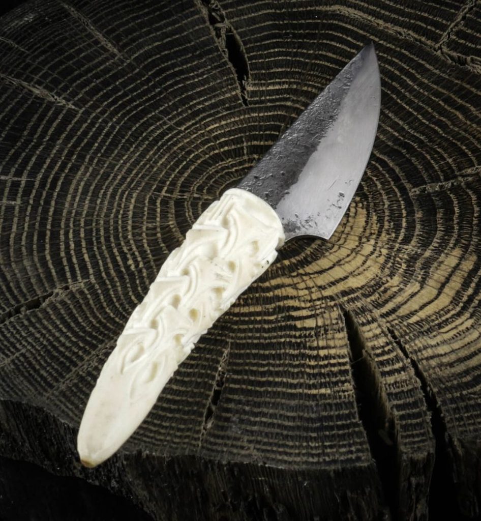 Kovaný nůž zasazený do jeleního parohu s vyřezávanými vikinskými motivy. Celková délka: 14.5 cm, délka čepele: 7.5 cm.