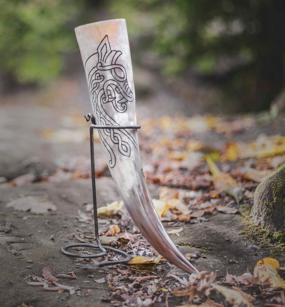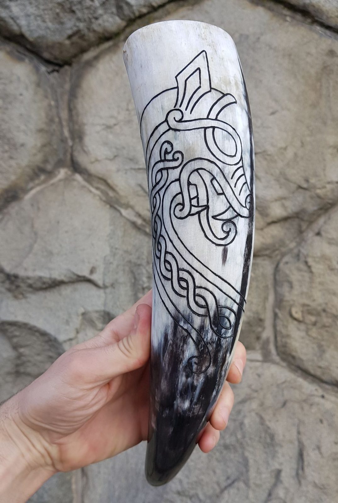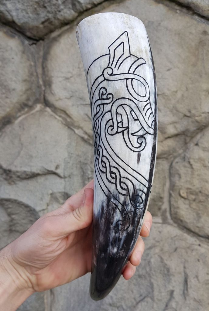 Vikinský drak. Roh je zevnitř ošetřený potravinářským bezbarvým lakem. Každý roh se může různě barevně lišit.