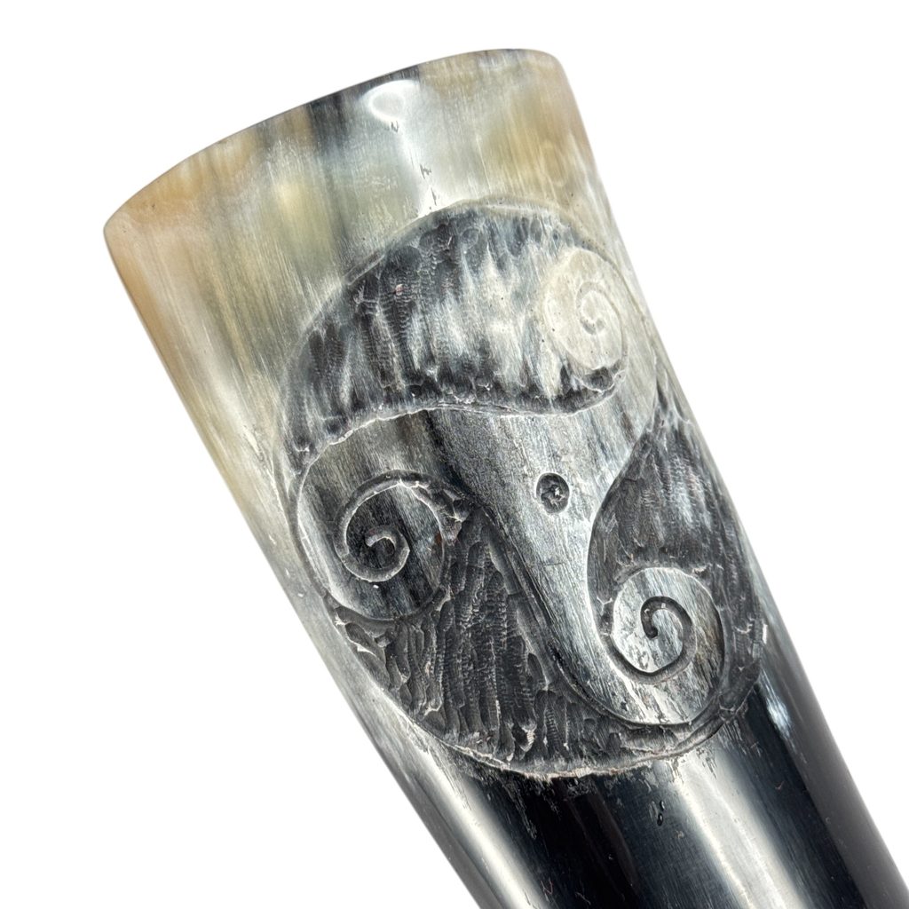 Leštěný kravský roh ošetřený zevnitř potravinářským bezbarvým lakem. Každý roh se může různě barevně lišit. Dovoz Drakkaria.