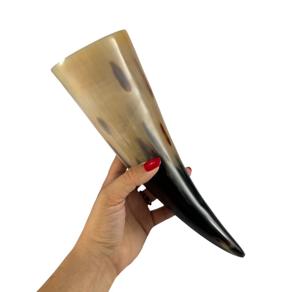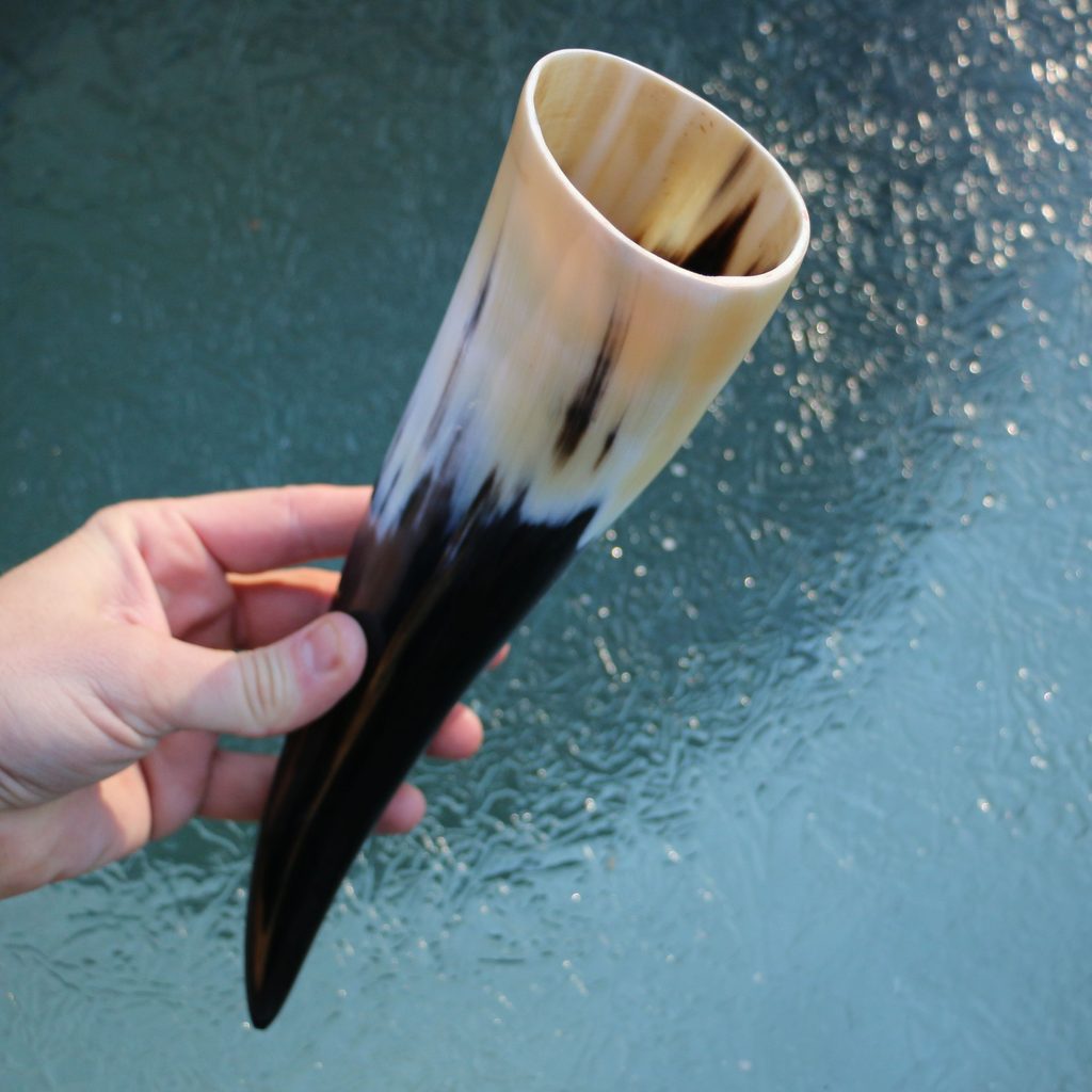 Tradiční roh na pití z pravého kravského rohu vyniká svým přirozeným zbarvením, které dává každému kusu jedinečný charakter. Tento typ nádoby používali už Keltové, Germáni i Vikingové při slavnostech a hostinách. Roh je pečlivě vyčištěn, vyleštěn a připraven k použití.