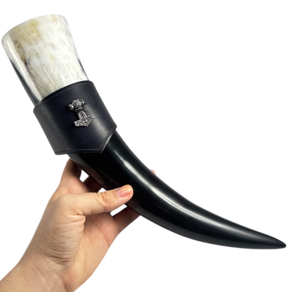Černý kožený držák na rohy v metalovém duchu. Thorovo kladivo, neboli Mjöllnir, je magická zbraň patřící bohu stejného jména. Jako závěs na krku ho nosili zejména severští válečníci a mořeplavci - vikingové. Thórovo kladivo je nerozbitné, vždy trefí svůj cíl a poté se navrátí do ruky svému majiteli. Toto kladivo létá po obloze ve formě blesku. Mjöllnir znamená v překladu „drtič”. Thór jej nepoužíval jenom k zabíjení obrů, nýbrž s ním mohl oživovat své kouzelné kozly, žehnal s ním k sňatkům, nebo oral pole. Aby Thor touto strašlivou zbraní mohl bezpečně vládnout, nosí kovové rukavice a opasek, který zdesetinásobuje jeho sílu.