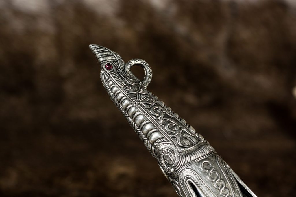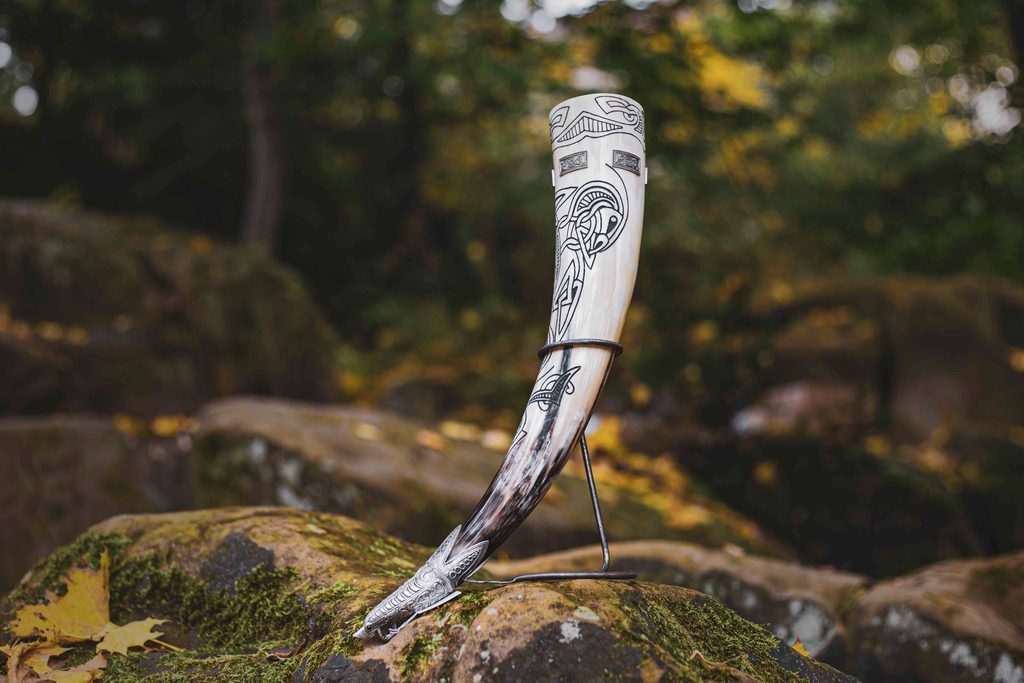 Luxusní roh s do nejmenšího detailu propracovanou cínovou koncovkou a dvěma granáty (almandiny) v očních jamkách. Očko na průvlek řemínku. Motiv mořské bestie byl převzat z nákončí na meč z pokladu, který byl nalezen na ostrově Ninian's Isle, Shetlandy, Skotsko. Ačkoli poklad byl nalezen ve Skotsku, motivy jsou skandinávské - obyvatelé Shetlandských ostrovů jsou dodnes potomci seveřanů. Má se za to, že pochází z 9. století. Délka: 12.5 cm. Motivy cínových zdobení u hrdla rohu pochází z ostrova Gotland (9. století), Švédsko.