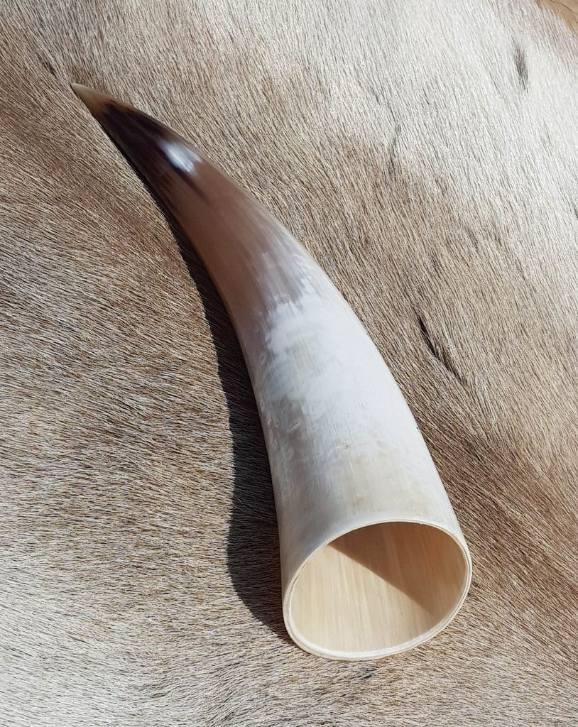 Sleipnir. Leštěný kravský roh na pití, ošetřený zevnitř potravinářským bezbarvým lakem. Každý roh se může různě barevně lišit.