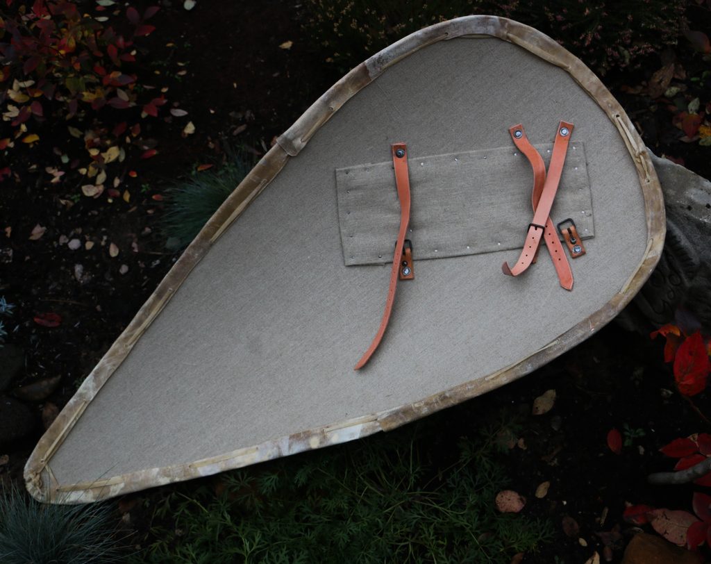 Mandlový štít - buková překližka, len, olemováno surovou kůží.