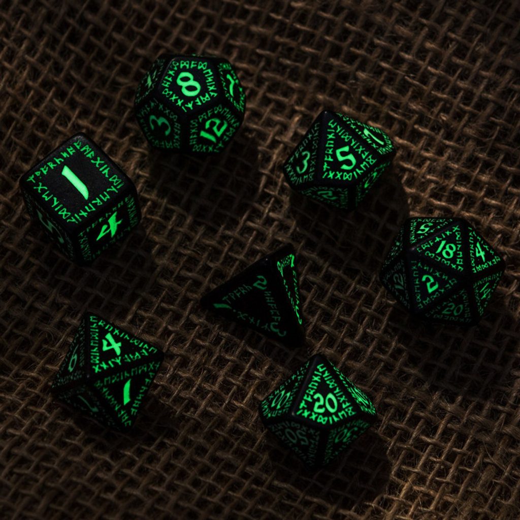 Runová černá sada kostek se svitem ve tmě je prodchnutá silou runy LAGUZ. Tato runa je spojena s univerzálním oceánem a vnitřní silou čekající v hlubinách – se životodárným světlem, které spojuje minulost, přítomnost a budoucnost. Voda je symbolem života a nezastavitelné síly, která obejde jakoukoli překážku. Runa připomíná magický šíp, který prostupuje vším jako proud vody. Tyto kostky jsou určeny pro mágy a hrdiny, kteří čerpají sílu ze svého nitra. Mají být světlem ve tmě, kdy moudrost zachrání den. Jsou to naše nejzáhadnější runové kostky – určené skutečným mistrům magie a ohýbání osudu.