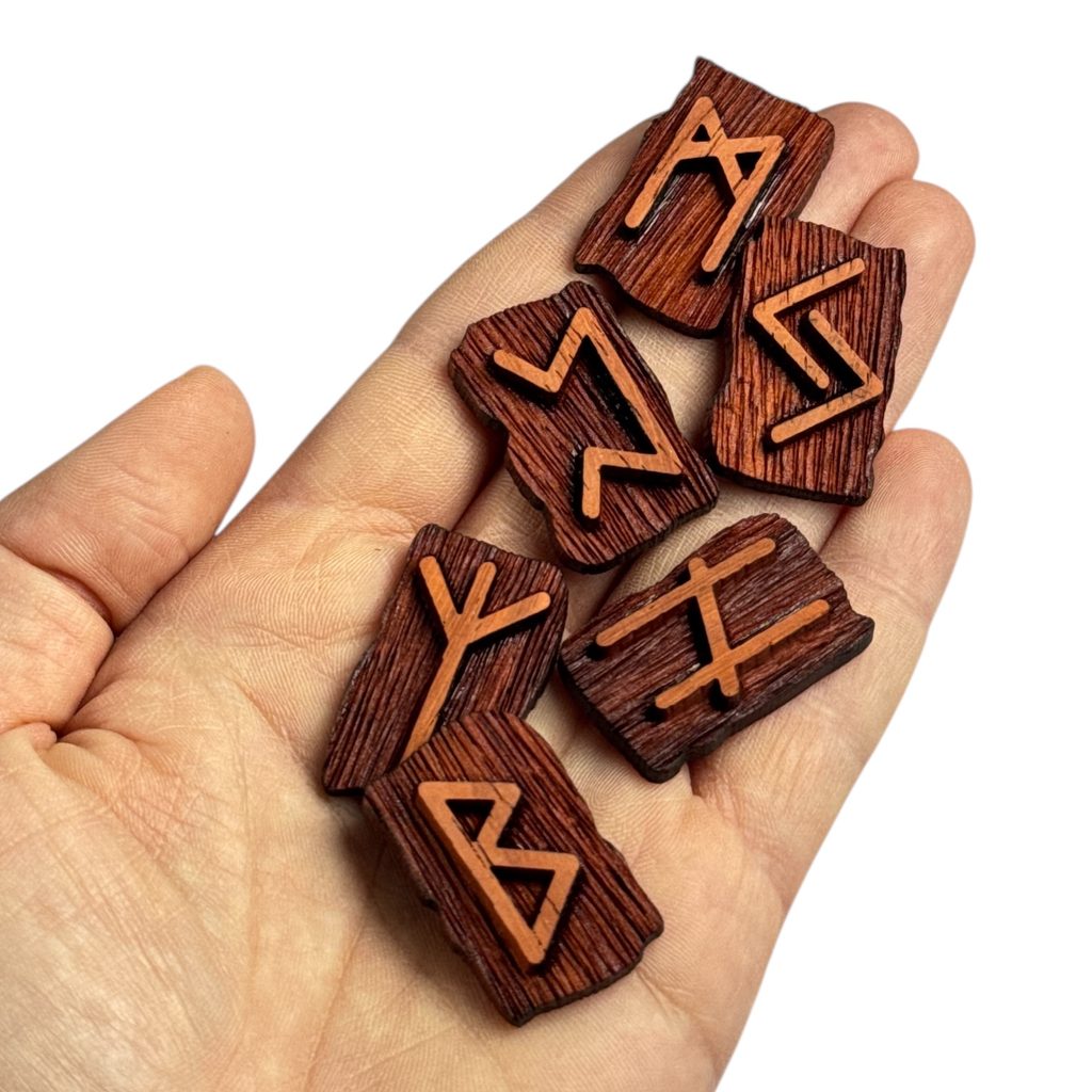 Sada dřevených run staršího Futharku s krásnou kresbou.