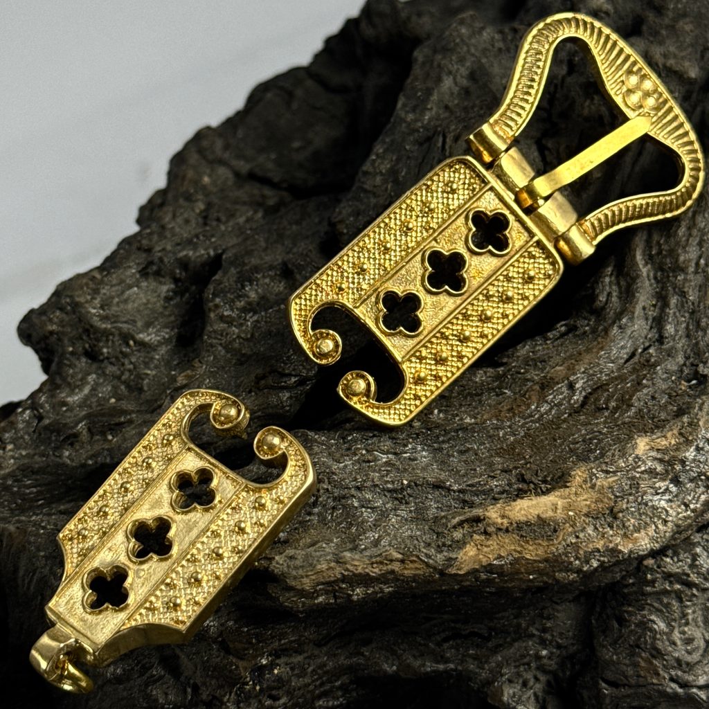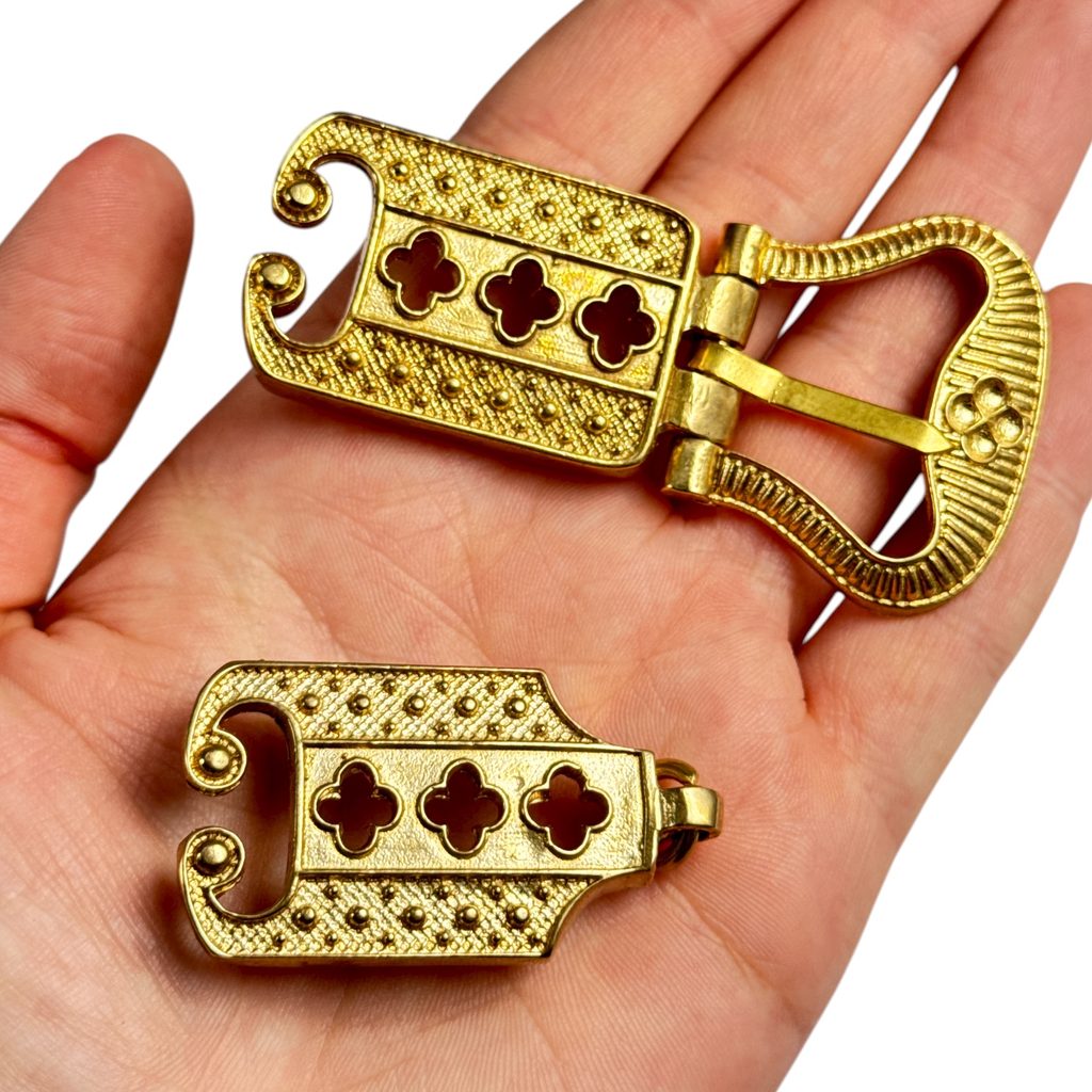 Tato replika opaskové sady pochází z Anglie z konce 15. století, období pozdní gotiky a vlády dynastie Tudorovců. Sada obvykle zahrnuje sponu, koncovku a někdy ozdobné prvky, které plnily jak funkční, tak dekorativní účel.