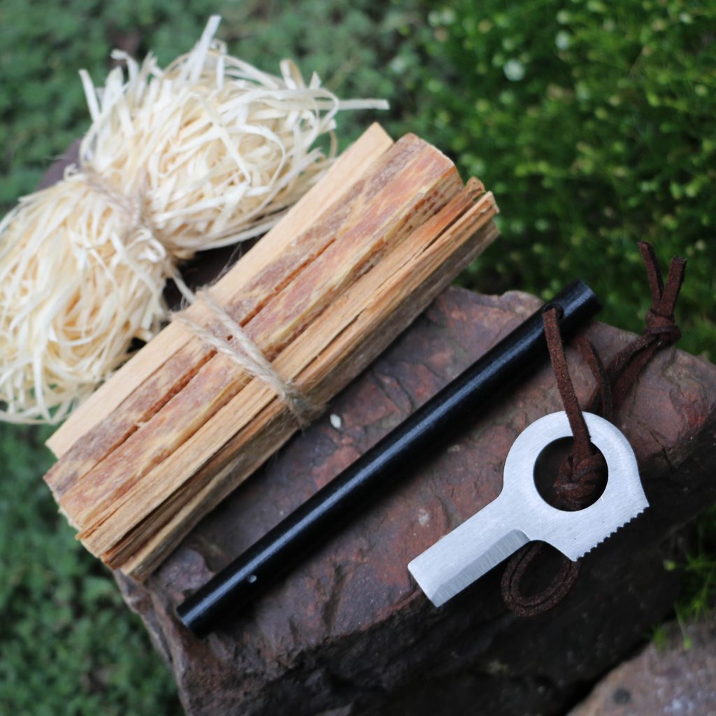 Sada na rozdělání ohně. Podpalovač vyrobený z odřezků borovice Pinus montezumae z Mexika, obsahující 80 % pryskyřice, proto je jednoduché jej zapálit. Stačí 1-2 tyčinky k rozdělání ohně.