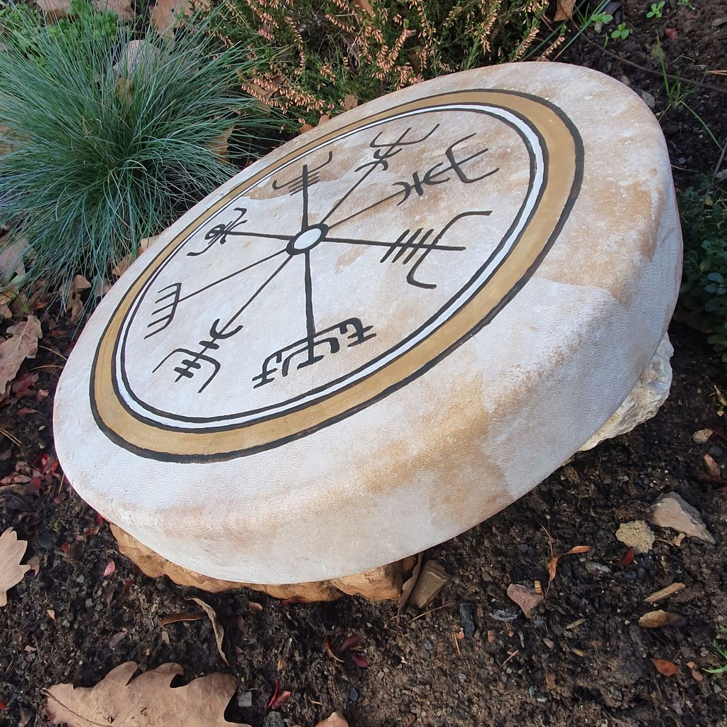 Ručně malovaný šamanský bubenvyroben z pravé jelení kůže natažené za mokra na dřevěnou obruč. Jednoduchý, přesto velice zvučný nástroj, který Vás ve správných rukách přivede do transu. Buben je vyzdoben islandským symbolem Vegvisir - Ukazatelem cesty. Symbol je na Islandu velmi populární a v knize z 19. století byl popsán takto: "Nositel tohoto symbolu nikdy neztratí svou cestu v bouřích a špatném počasí, a to i v situaci, kdy jeho cesta není známa."
