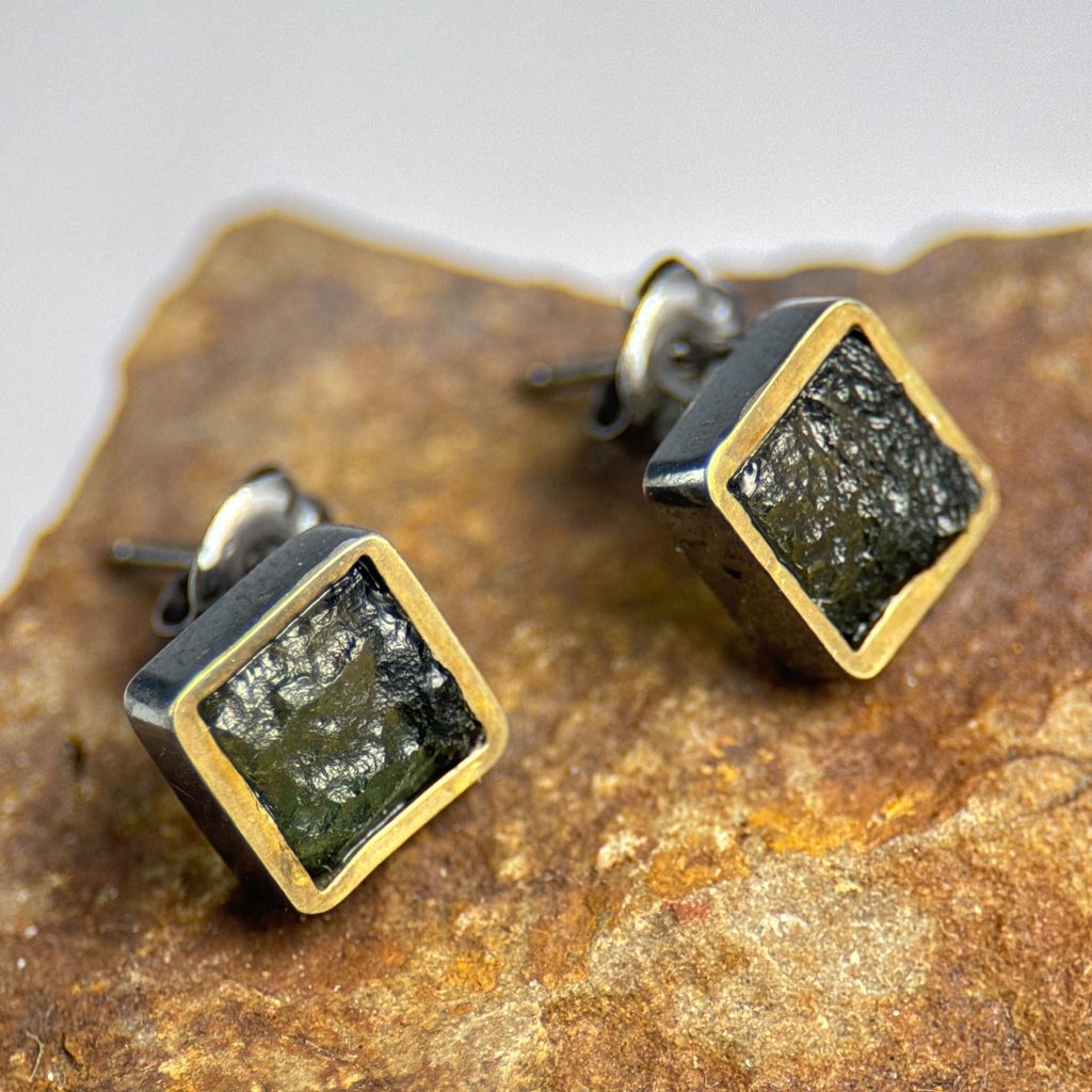 Tyto stříbrné náušnice s pravým vltavínem z jižních Čech představují šperk s hlubokým historickým a přírodním významem. Vltavín, vzácný druh tektitu zelené barvy, vznikl před 15 miliony lety po dopadu meteoritu v oblasti dnešní střední Evropy - Bavorska. Tento šperk je symbolem propojení země a vesmíru. Vltavíny jsou velmi ceněné drahé kameny jejichž hodnota neustále stoupá a existuje jich jen omezené množství.