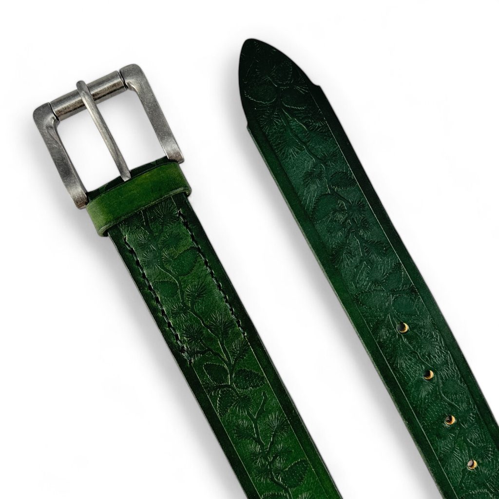 Kvalitně ručně vyrobený kožený opasek z hovězí usně s vyraženým lesnickým motivem šišek. Opasek pochází z vlastní produkce.