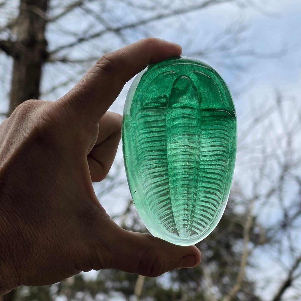 Skleněný trilobit Conocoryphe - těžítko nebo nenápadná dekorace na zahradu. Ruční práce z malé české sklárny, kde trilobiti jsou v okolních kopcích jako doma :)