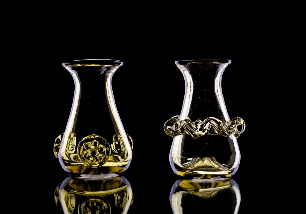 Panáková souprava.Vyrobeno z tzv. lesního skla. Každý kus se trochu liší a je originálem zhotoveným ruční výrobou v české rodinné sklárně, nikoli průmyslovým litím skla.