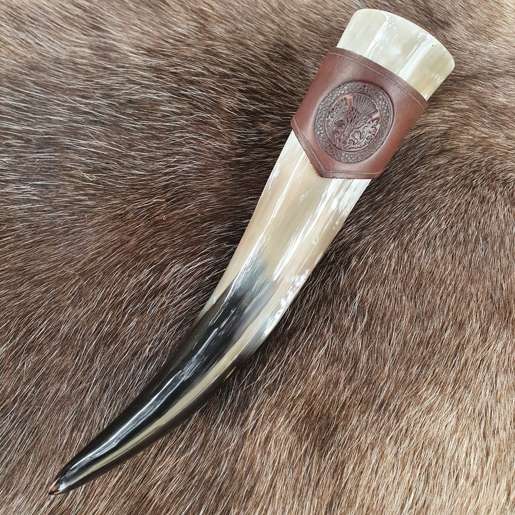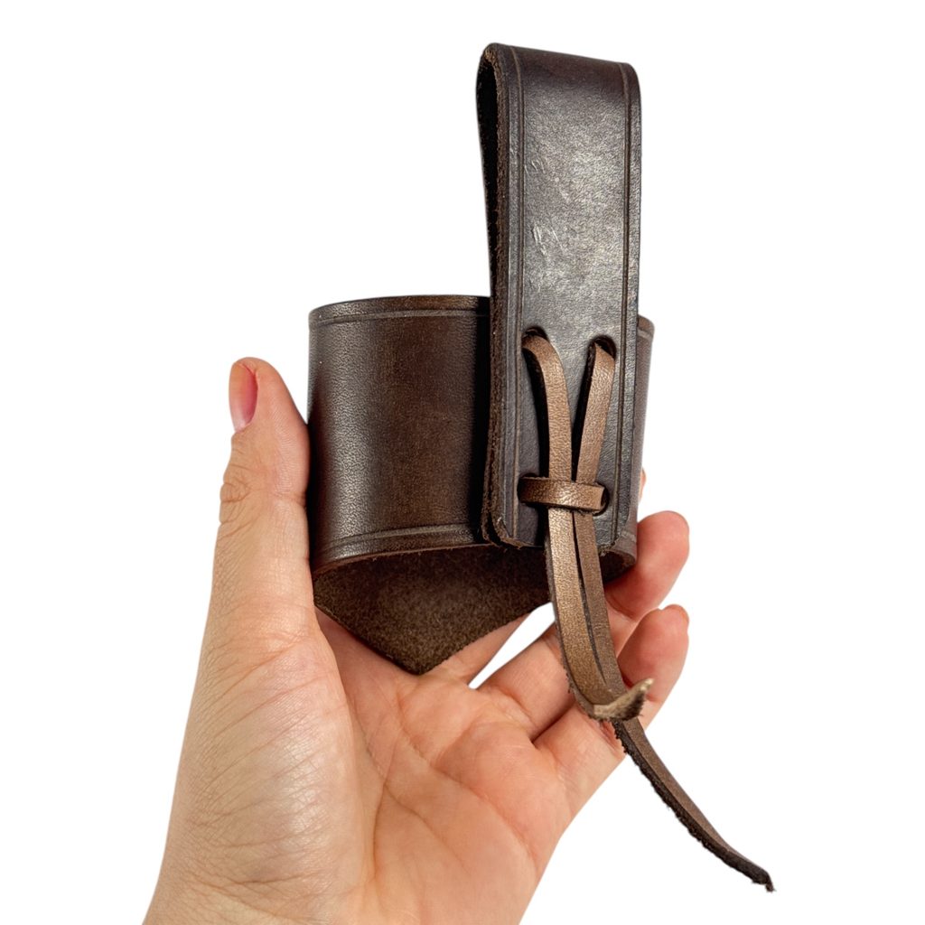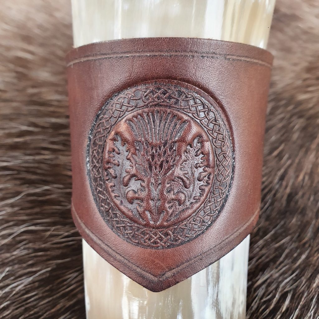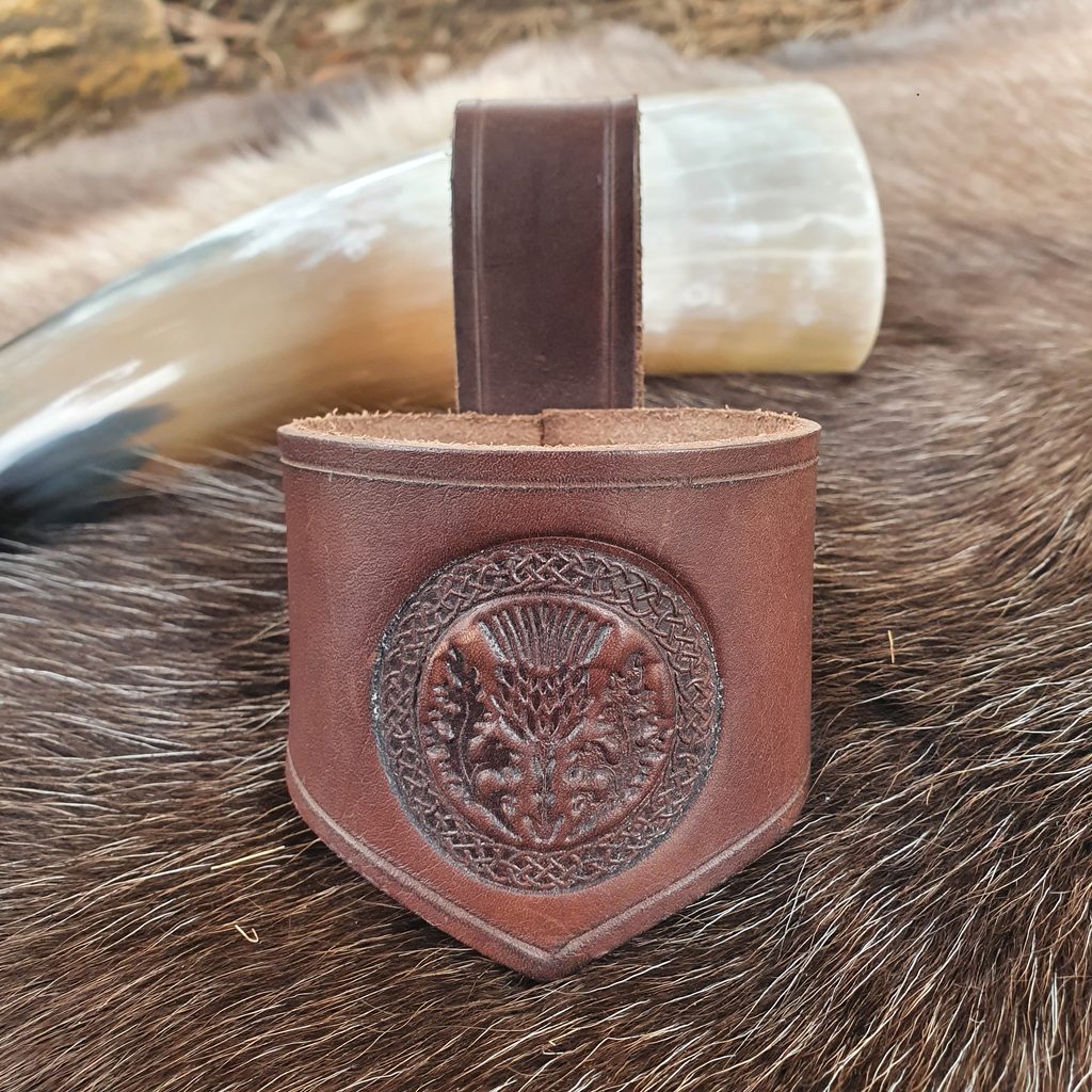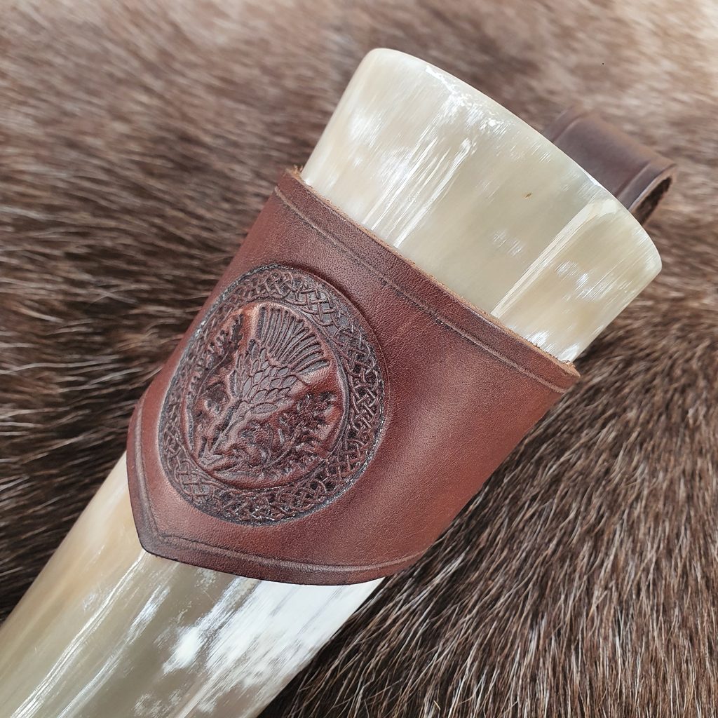 Kožený držák na rohy na pití zdoben ražením.