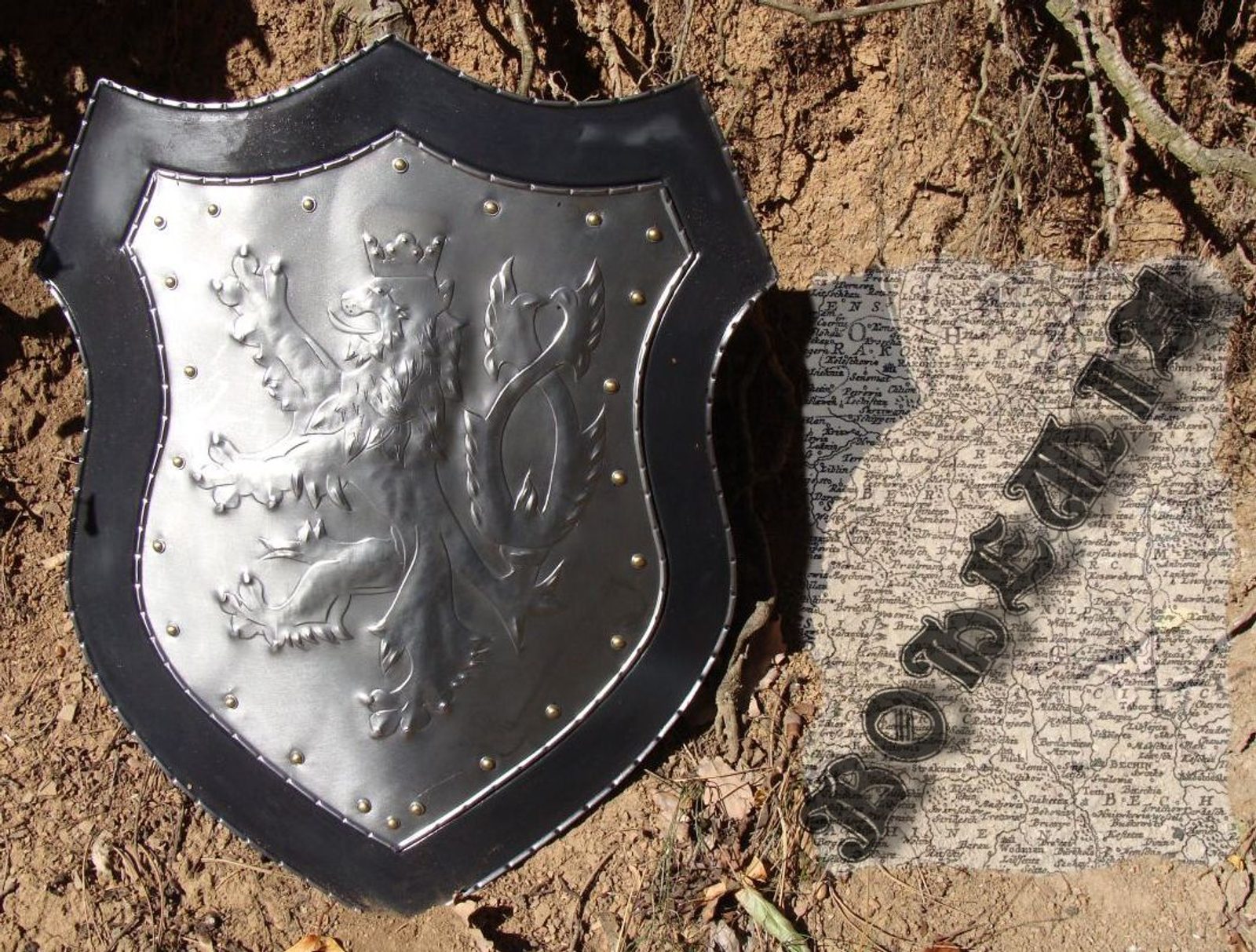 Stříbrný lev ve skoku - mnoha set let starý symbol českých zemí. Pokud si nechcete na krb nebo na zeď zrovna dávat svůj rodový erb, možná toto se pak nabízí jako jedna z alternativ. Rozměry cca 50 x 60 cm, síla plechu 0,8 - 1 mm. Pro dekorační účely. Z duhé strany jsou přichycena kožená poutka, a tak se dá nosit do průvodu anebo na LARPy.
