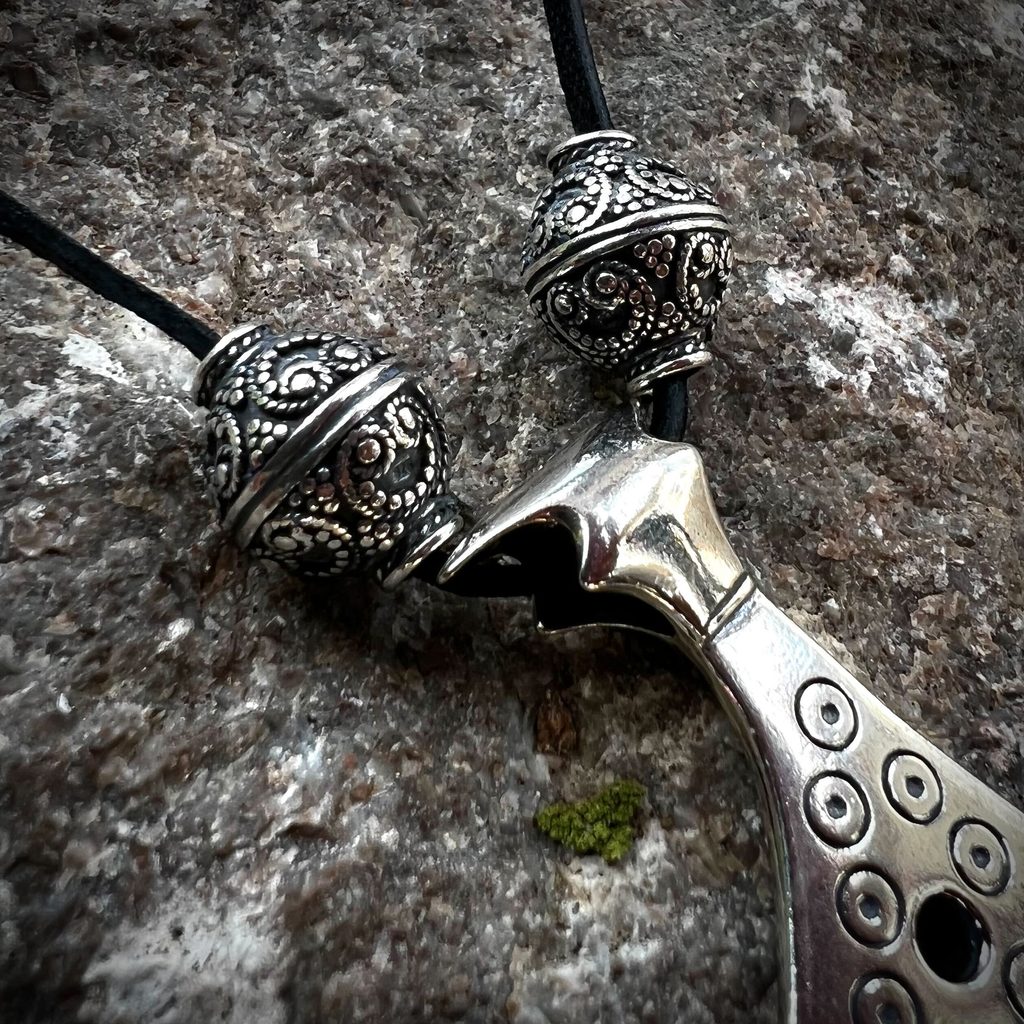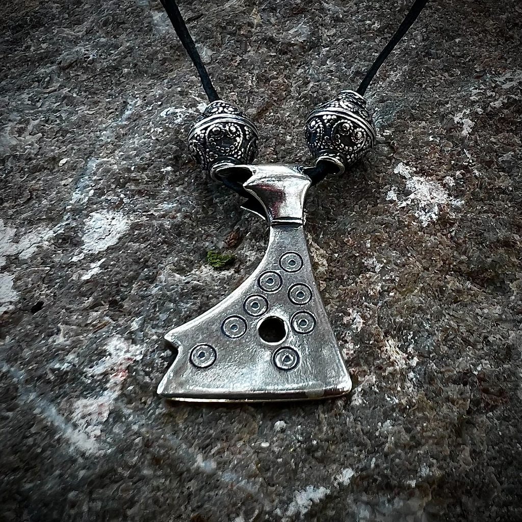 Replika slovanského přívěšku, ze kterého byl vytvořen náhrdelník (dva stříbrné gombíky). Délka sekerky cca 4,7 cm. Váha cca 7 g (13 g i s gombíky).