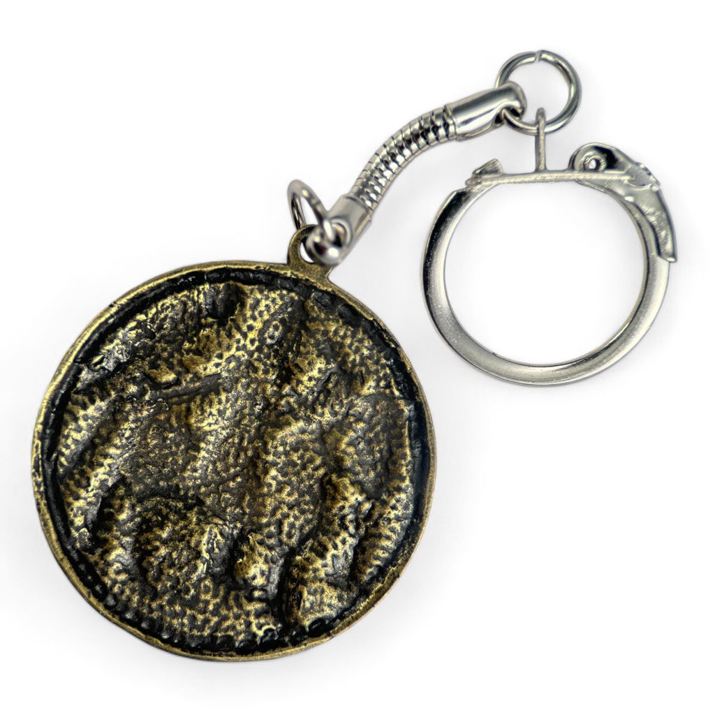 Velmi zdařilá reprodukce velkomoravského terčíku se sokolníkem na koni. Původní nález pochází ze Starého Města na Moravě u Uherského Hradiště. Tento vytepávaný šperk z hrobu XV ve Starém Městě Na Špitálkách je považován za vrcholné dílo velkomoravské toreutiky.