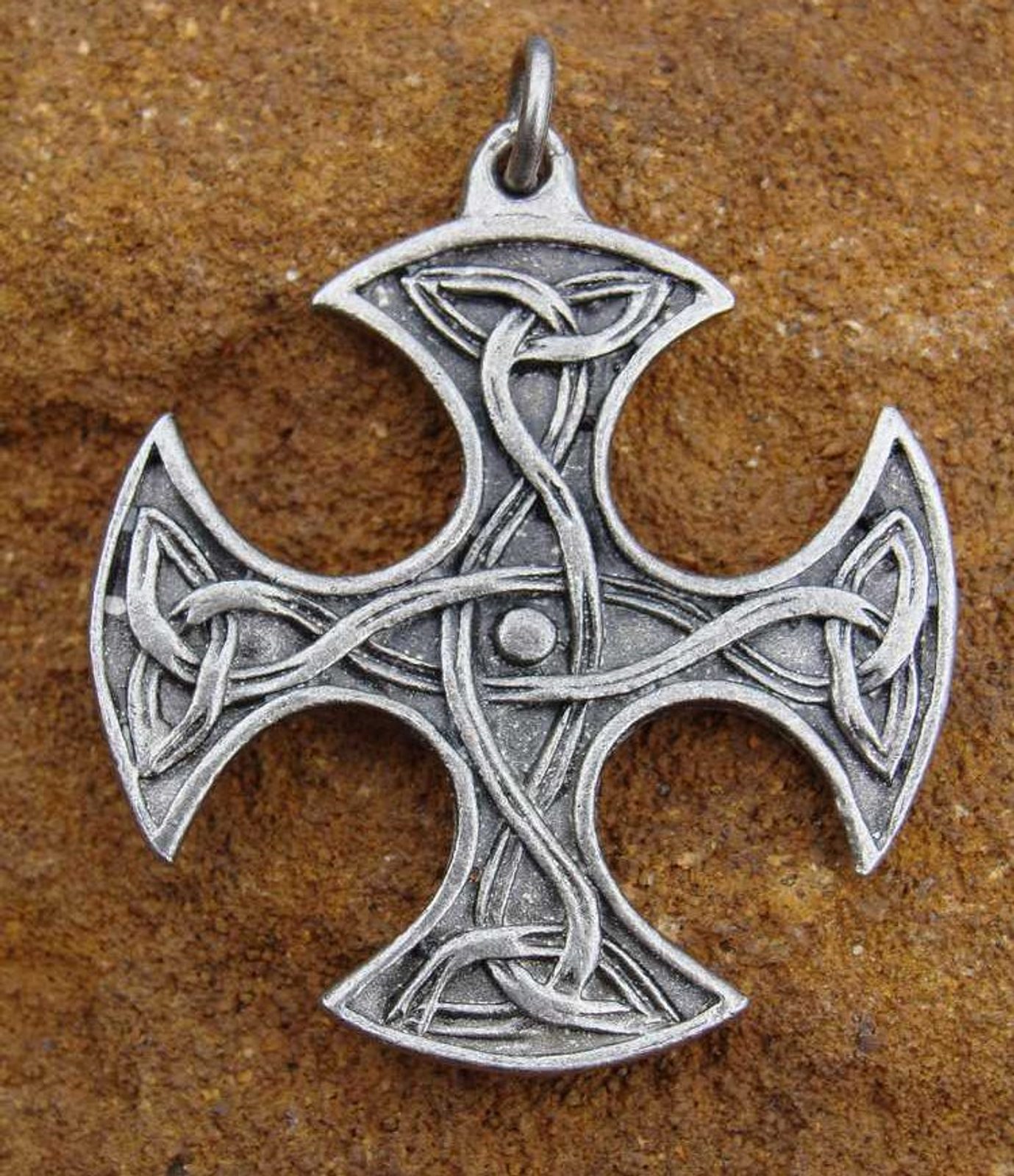 KELTSKÝ PROPLETENÝ KŘÍŽ, talisman. Keltský kříž je kombinace křesťanského kříže a pohanského symbolu Bohyně měsíce (kruh) a byl pravděpodobně zaveden sv. Patrikem. Bývá také nazýván "Sluneční Kříž". Velikost cca 3,5 x 3,5 cm. Materiál: slitina kovů (pewter), schváleno hygienikem ČR.