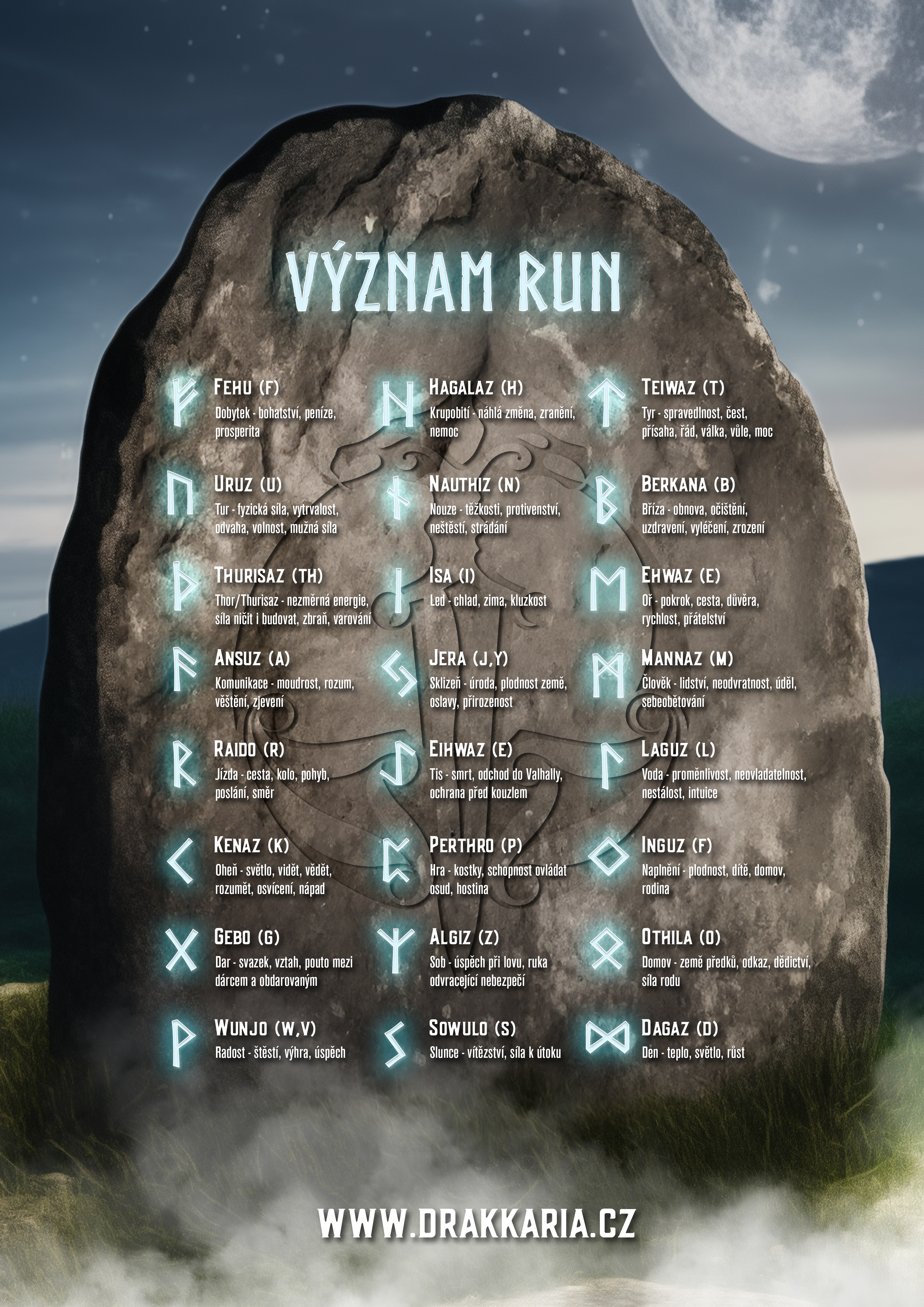 Germánské runy nabízíme v podobě cínových přívěšků, kovaných amuletů anebo run vyřezávaných do parohu. Runy se používaly spíše jako posvátné písmo hodné k zaznamenání důležitých událostí nebo k magické ochraně lidí či věcí. Runám se přičítá božský původ. Za původní runovou abecedu se pokládá 24 run neboli starší Futhark, které byly zjeveny Odinovi, když po devět dní a nocí visel na stromě proklát oštěpem v oběť sám sobě - Význam run