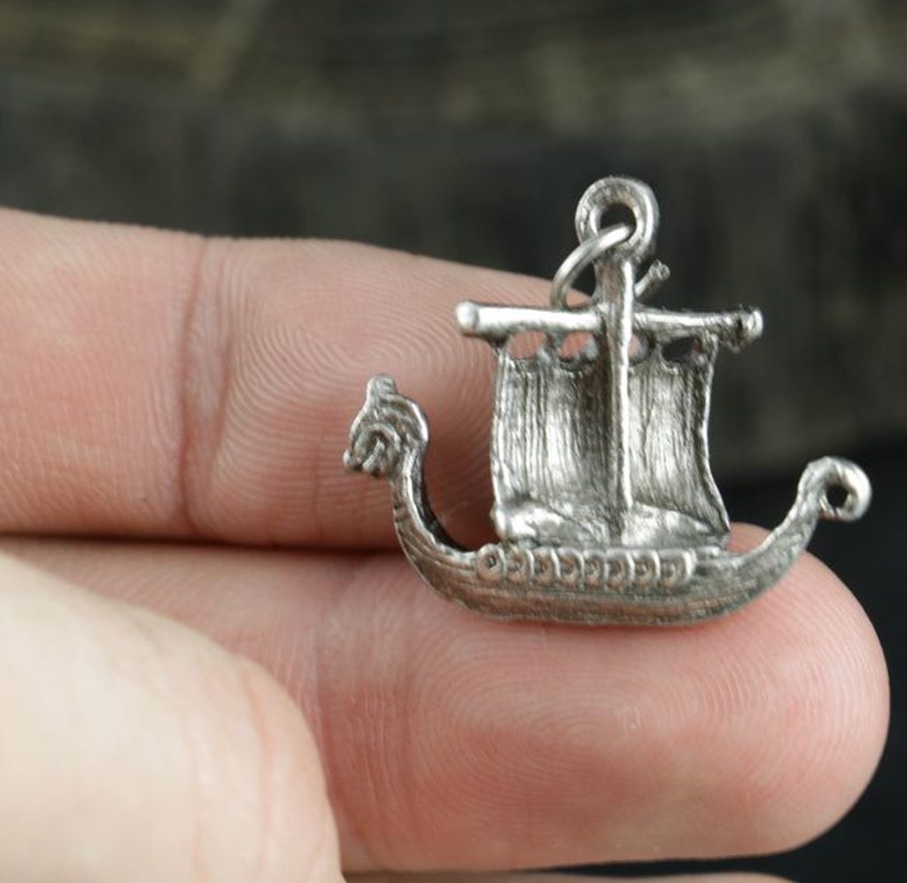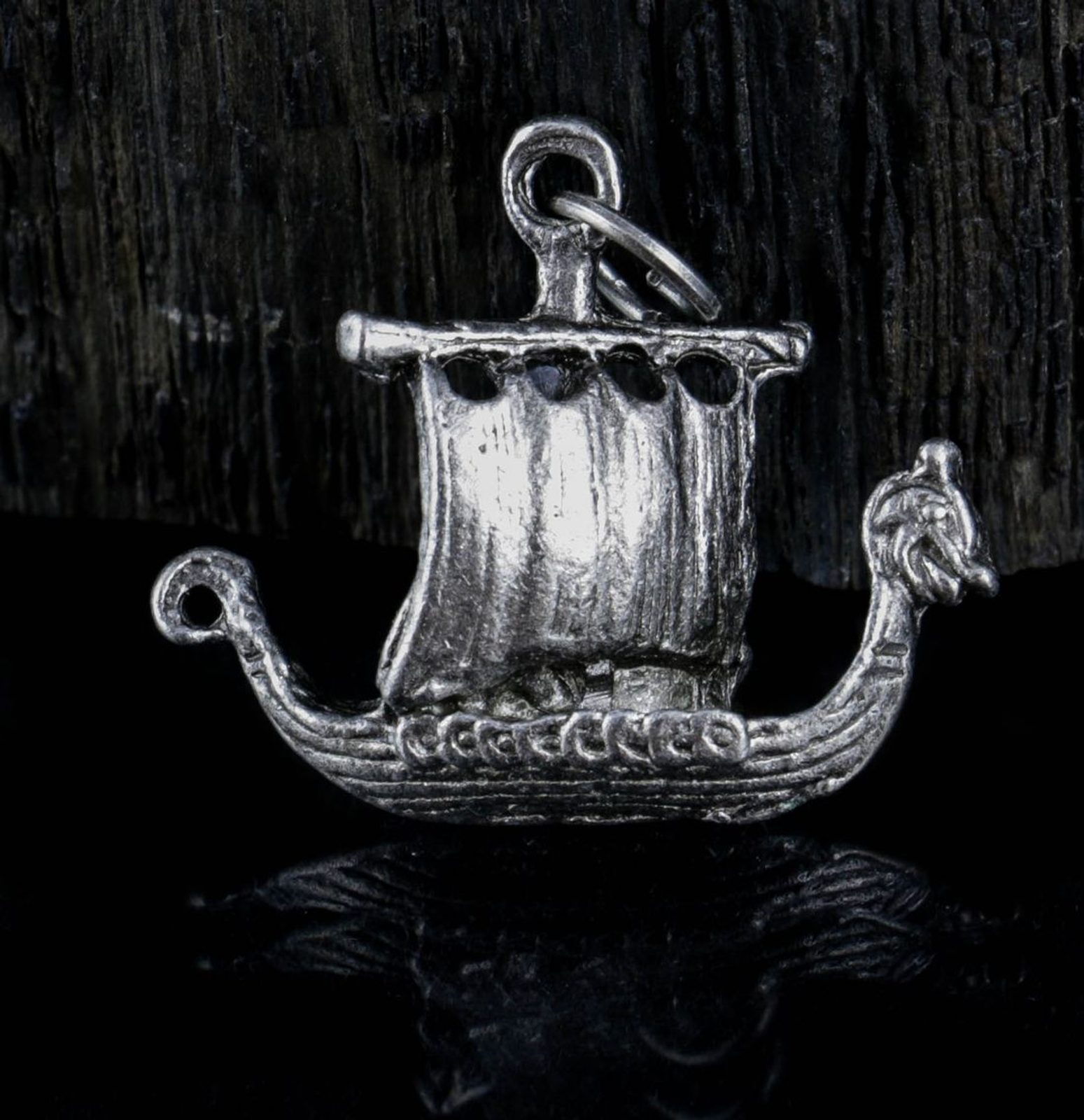 Drakkar - vikingská nájezdnická loď. Drakkar, nejznámější z nejpozoruhodnějších válečných veslic, byly symbolické legendárním Vikingům. Poměrně pozdní vynález (11. století), tyto lodě byly používány primárně jako kruté a brutální válečné lodě. Cínový přívěšek. Rozměry: 2.4 x 3 cm.