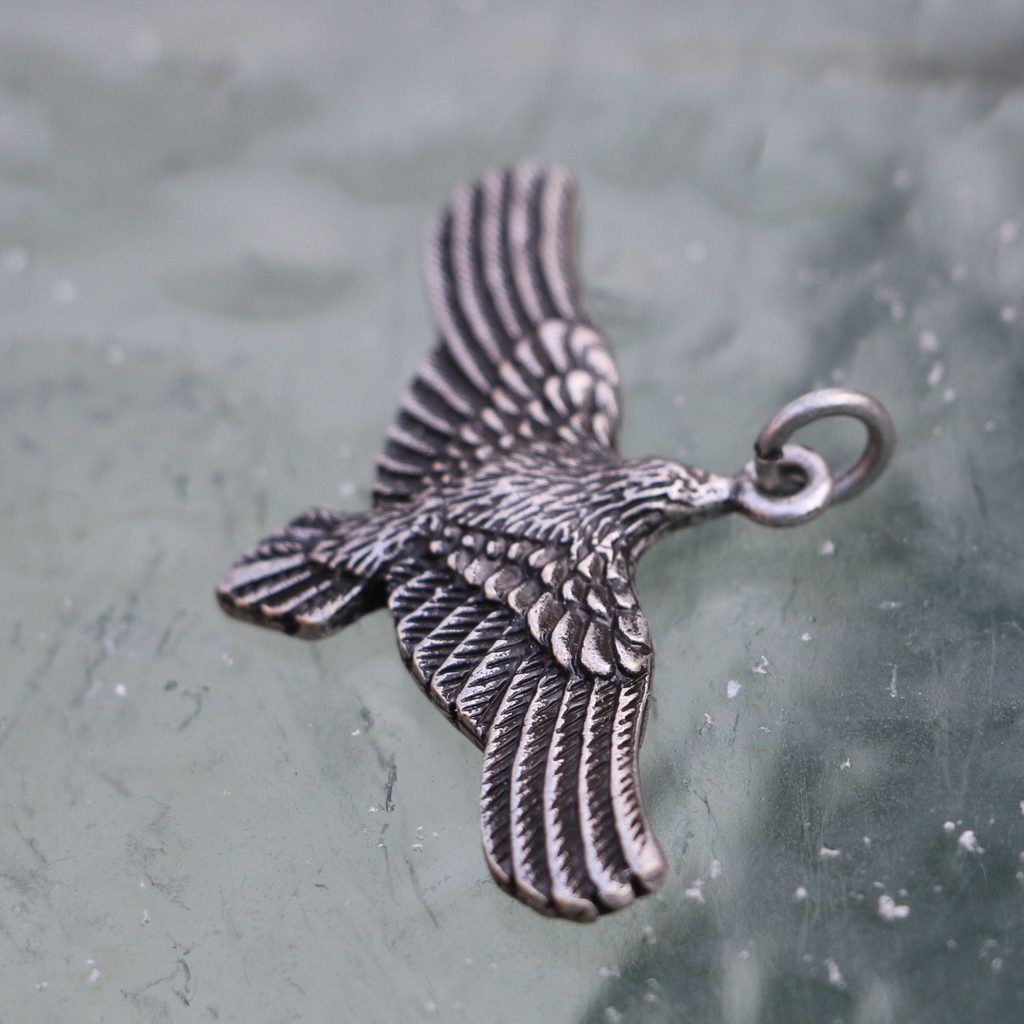 Precizně a detailně zpracovaný přívěšek letící vrány. Vrány jsou černými přizraky nebes, odjakživa zaujímají přední místo ve významu mnohých evropských kultur a mytologií. U vikingů jsou spjaty s bohem Odinem. U Keltů mají vrány též přední postavení, jejich duchovní představitelé, Druidové, tyto ptáky vnímali jako symbol změny - smrti jedné fáze života a začátku nové.