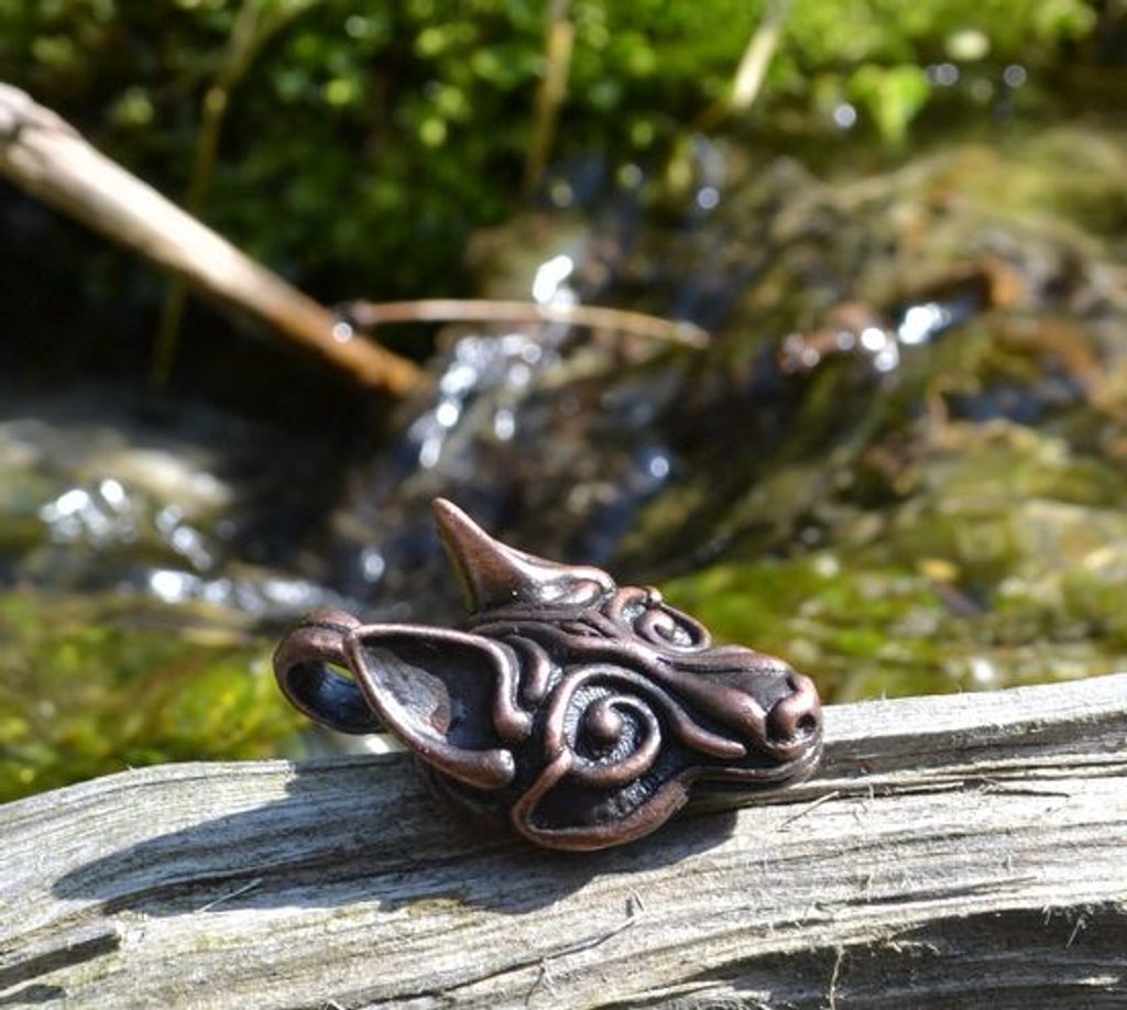 Šperk je naším vlastním výrobkem a pokládáme jej za jeden z našich nejosobitějších šperků s vlčí tématikou. Materiálem je slitina cínu, ručně odlito, poměděno a opatinováno.