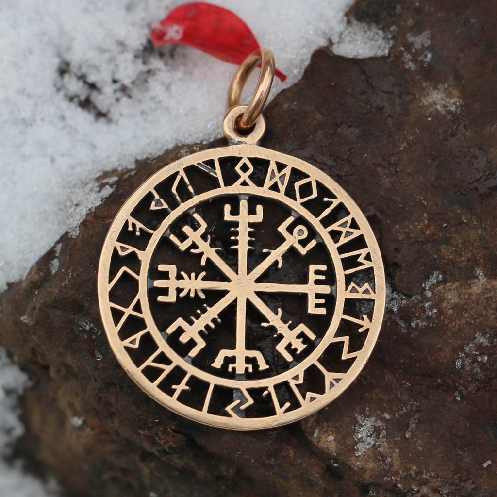 Bronzový přívěšek s motivem Vegvísiru představuje islandský magický symbol, jehož název znamená „ten, co ukazuje cestu“.