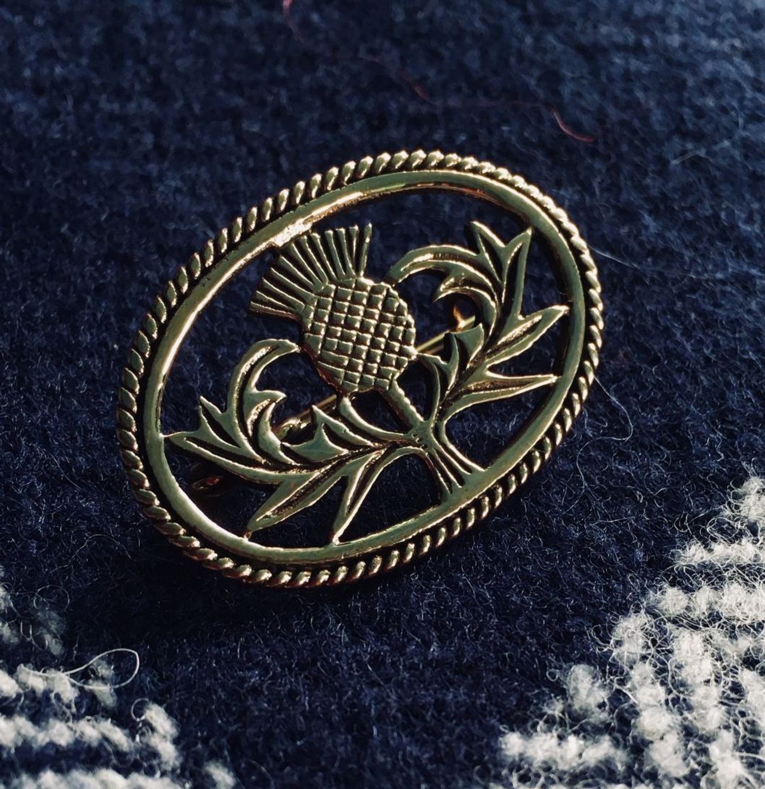 Bronzová brož s motivem skotského bodláku. Kromě známěho vzoru látek skotské kostky (tartan) není typičtější symbol této země. Podle jedné legendy tento skromný pichlavý plevel zachránil spící skotské bojovníky před přepadením severských nájezdníků. Jeden z nepřátel vykřikl bolestí poté, co stoupl na trnitou rostlinu, a tak vzbudil spící Skoty. Ti pak náležilitě vetřelce potrestali a přijali bodlák jako svůj symbol.