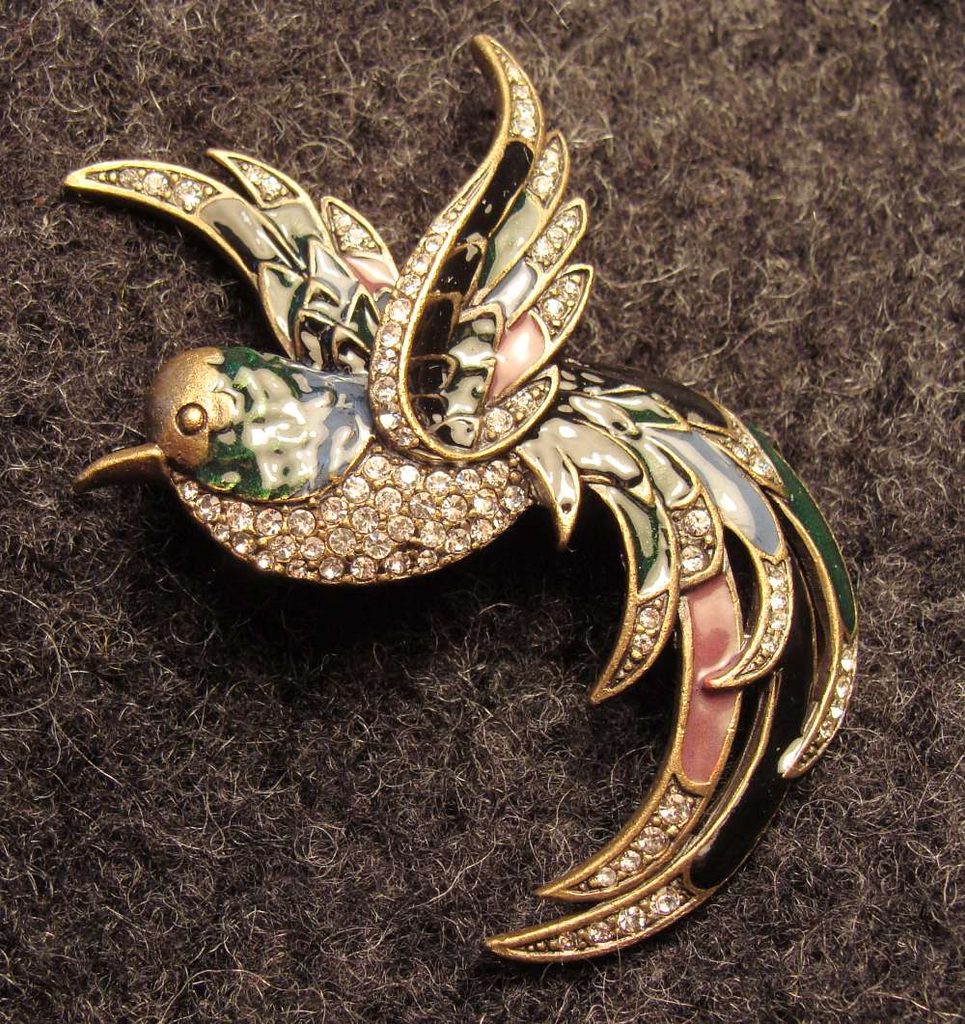 Velká kostýmová brož z kovu, skla a smaltu. Velikost cca 5 x 7 cm.
