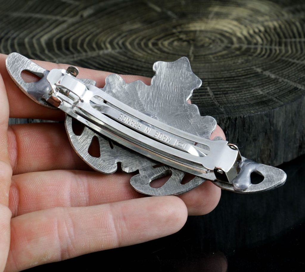 Cínová vlasová spona v secesním designu se zeleným mužem (maskaronem).