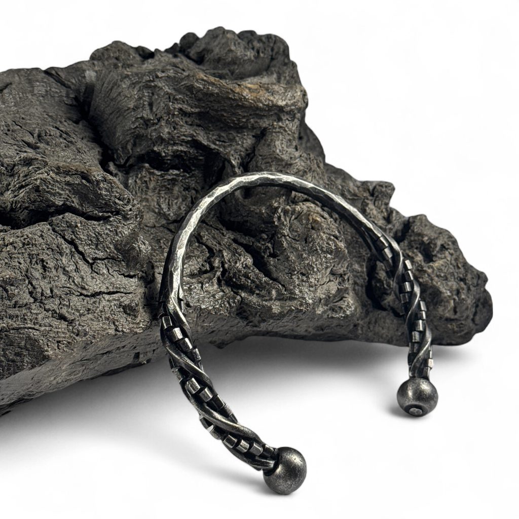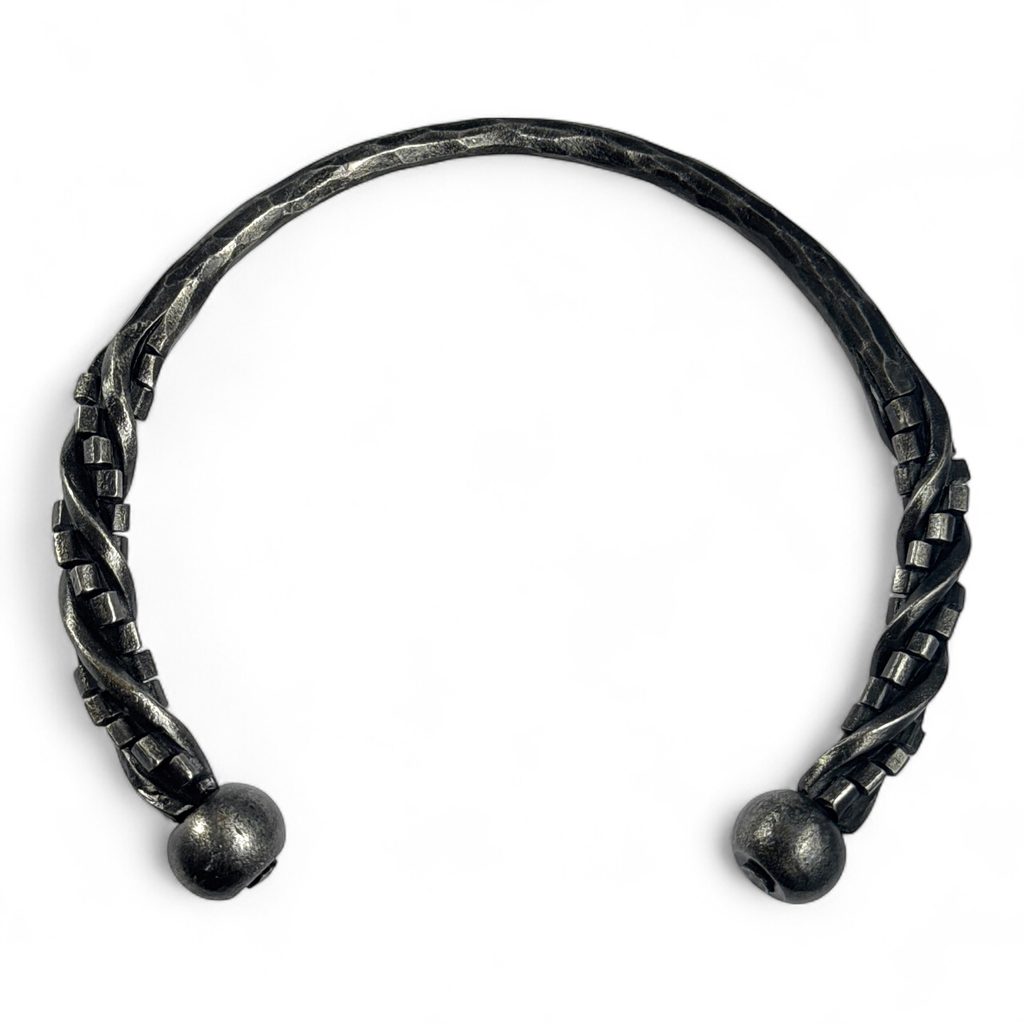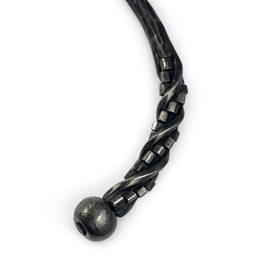 Spojení historie a moderního designu. Kovaný nákčník - torques, šperk vládců, reků, druidů, ale i Bohů starověku a raného středověku. Nyní se tímto šperkem můžete honosit i Vy. Šperk je ve výhni kovaný, černěný dubovou kůrou a lakem ošetřen proti korozi.