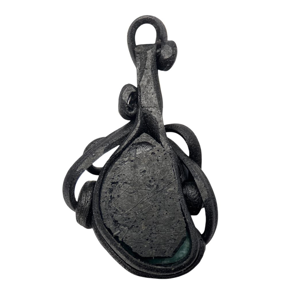 Přívěšek na krk se zasazeným kamenem - amazonit. Je znám jako drahý kámen už od časů egyptských faraonů, stejně tak je posvátným kamenem jihoamerických indiánů. Mineralogicky se jedná o K-živec (draselný živec - mikroklín). Výtečné naleziště je v Rusku: lokalita Ploskaya.