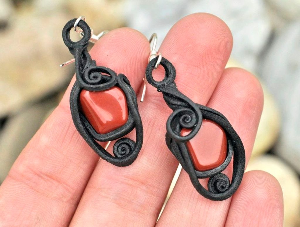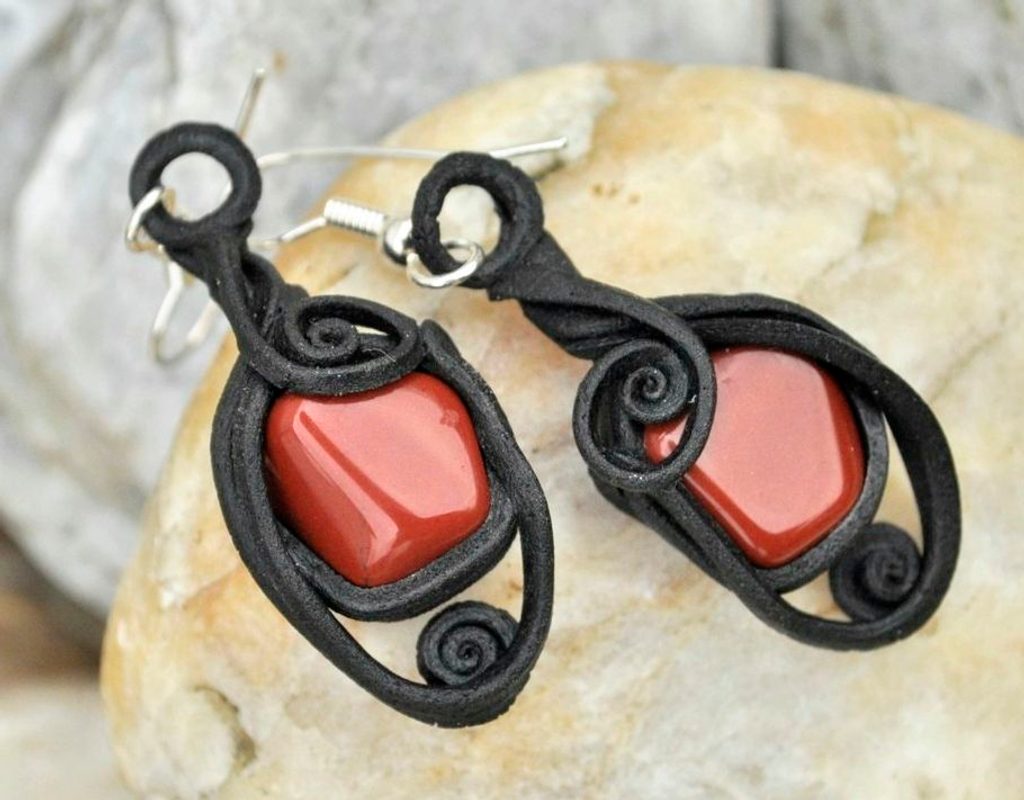 Náušnice s pevně ukotveným jaspisem. JASPIS byl v minulosti (renesance) označován jako kámen všech kamenů, a měl především hojné uplatnění ve šperkařství. Jsou jím ozdobeny i stěny chrámu svatého Víta nebo Karlštejna. Mineralogicky se jedná o odrůdu křemene. Známé jsou u nás lokality např. na Ještědsko-Kozákovském hřbetě.